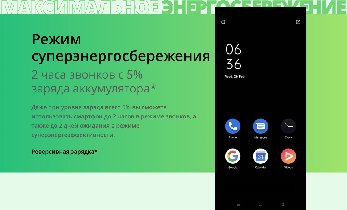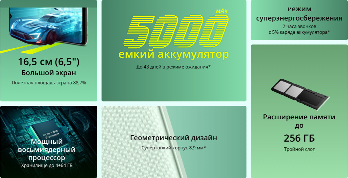 Смартфон получил Realme NARZO 50i 6,5-дюймовый дисплей с яркостью 400 нит, разрешением HD+ и небольшим вырезом для фронтальной камеры на 5 МП. Сзади расположена одинарная камера на 8 Мп.АККУМУЛЯТОРВ realme narzo 50i установлен аккумулятор на 5000 мА*ч, но без функции быстрой зарядки. Производитель обещает 43 дня работы в режиме ожидания, 43 ч разговоров, 23 ч просмотра YouTube или 10 ч игр. Функция энергосбережения обеспечивает 2 ч разговора или 2 дня работы в режиме ожидания при заряде на уровне 5 %. За такую автономность можно даже простить порт Micro-USB для зарядки.ПРОЦЕССОРВ новинке используется процессор Unisoc SC9863A с 2/4 ГБ ОЗУ LPDDR4X и 32/64 ГБ дискового пространства. Слот для карты памяти тоже отдельный. Аппарат работает на Android 11 c оболочкой Realme UI Go.