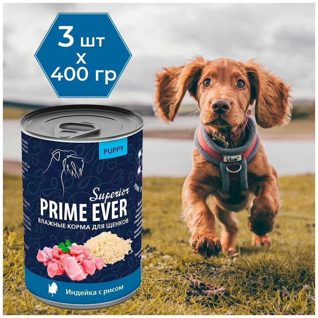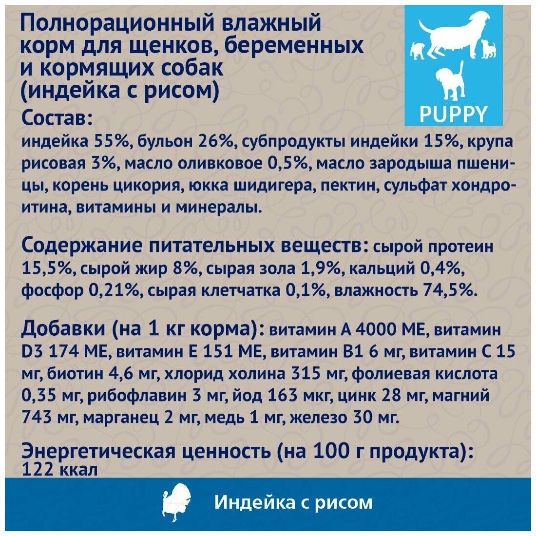 Влажный корм для щенков Prime Ever Superior индейка с рисом — это сочетание свежего мяса индейки с цельным рисом.Лакомство подаётся в виде ароматных мясных волокон и крупнорубленного фарша с добавлением нежного бульона.В составе только натуральные полезные ингредиенты, которые обеспечат питомца всем необходимым для поддержания прекрасного внешнего вида и здоровья в целом.Благодаря сбалансированному составу мясного сырья, витаминов и минеральных веществ, животное получает полный комплекс питательных веществ. Питомцу не требуется покупка дополнительных витаминных добавок. Корм обладает высокой вкусовой привлекательностью.Не содержит злаков, соевого белка, ГМО, консервантов, красителей и ароматизаторов. Корм изготовлен в соответствии со стандартами FEDIAF (Европейская федерация производителей кормов для животных).Применение: рекомендуемая суточная норма примерно 50-70г на 1 кг веса животного, в зависимости от его активности. Оптимальная температура продукта для кормления – комнатная. Следите, чтобы у питомца всегда была чистая свежая вода без ограничений.