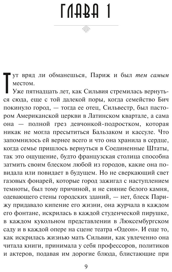 Сильвию затягивает водоворот новых знакомств, литературная жизнь в Париже бурлит и искрится. Эрнест Хемингуэй, Фрэнсис Скотт Фицджеральд, Джеймс Джойс, Эзра Паунд — все они в те годы еще не почтенные классики, а дерзкие честолюбивые люди со сложными характерами. Магазин Сильвии становится для них центром притяжения, но и столкновения неизбежны. Разочарования и предательства не заставят себя ждать, минуют ревущие двадцатые с их бесшабашными вечеринками, но двери "Шекспира и компании" останутся открытыми для всех, кто не мыслит своей жизни без книг.
