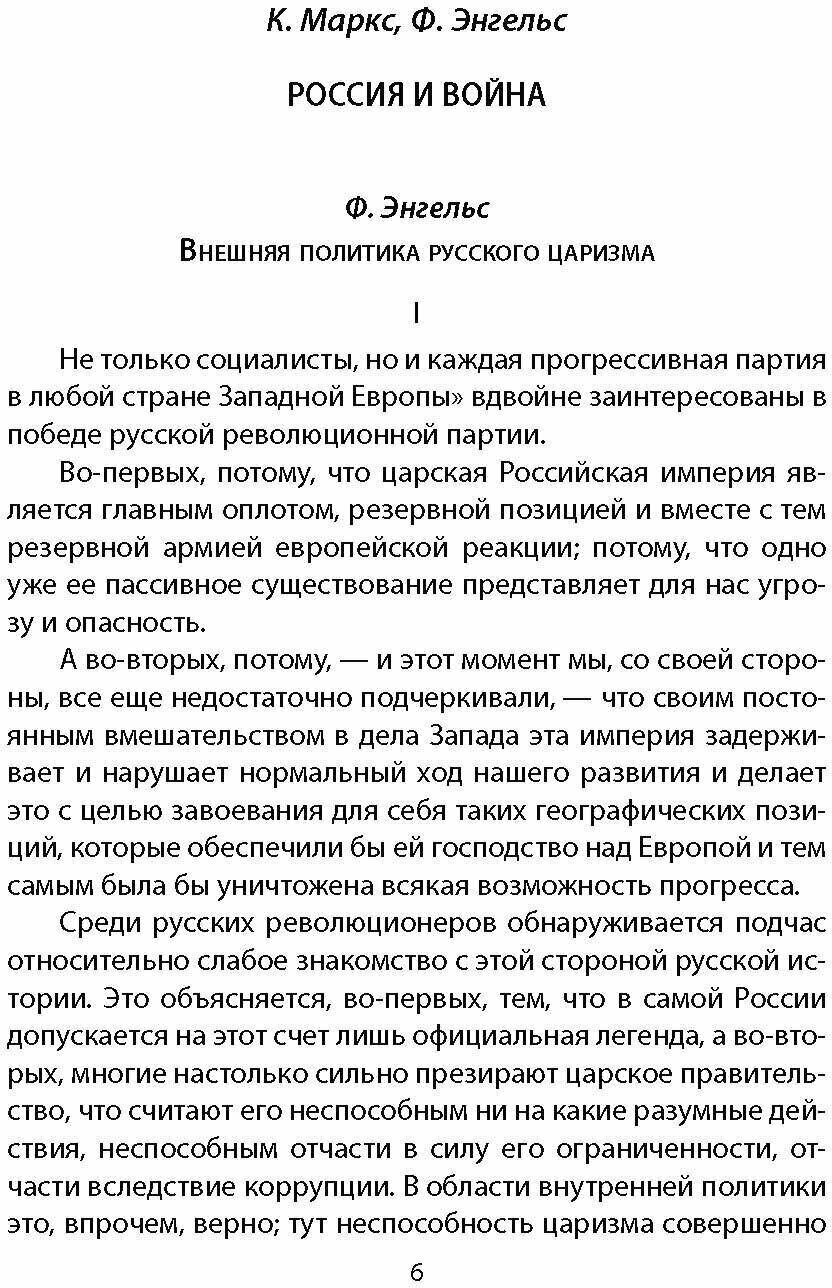 «Чтобы самодержавно господствовать внутри страны, царизму необходимо непрерывно одерживать победы. В глазах вульгарно-патриотической публики следующие одно за другим завоевания, могущество и внешний блеск царизма с избытком перевешивают все его грехи, весь деспотизм, все несправедливости и произвол; шовинистическое бахвальство с лихвой вознаграждает за все пинки», – писал Фридрих Энгельс. Маркс и Энгельс оценивали внешнюю политику царизма в XVIII-XIX веках с классовых позиций и приходили к выводу, что каждая его победа, укрепляя власть, лишь усиливает угнетение народа. Подобную же оценку давал В.И. Ленин, говоря об участии России в Первой Мировой войне. Он считал, что «национальная гордость», переходящая в воинствующий шовинизм, служит на пользу существующему режиму, а поражение в войне, напротив, может привести к падению царизма. В книге представлены работы Маркса, Энгельса и Ленина, посвященные этой теме.