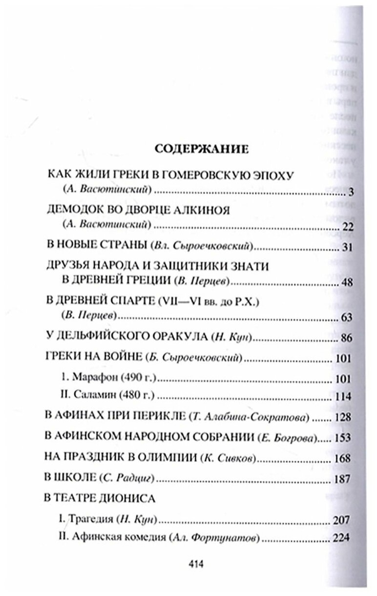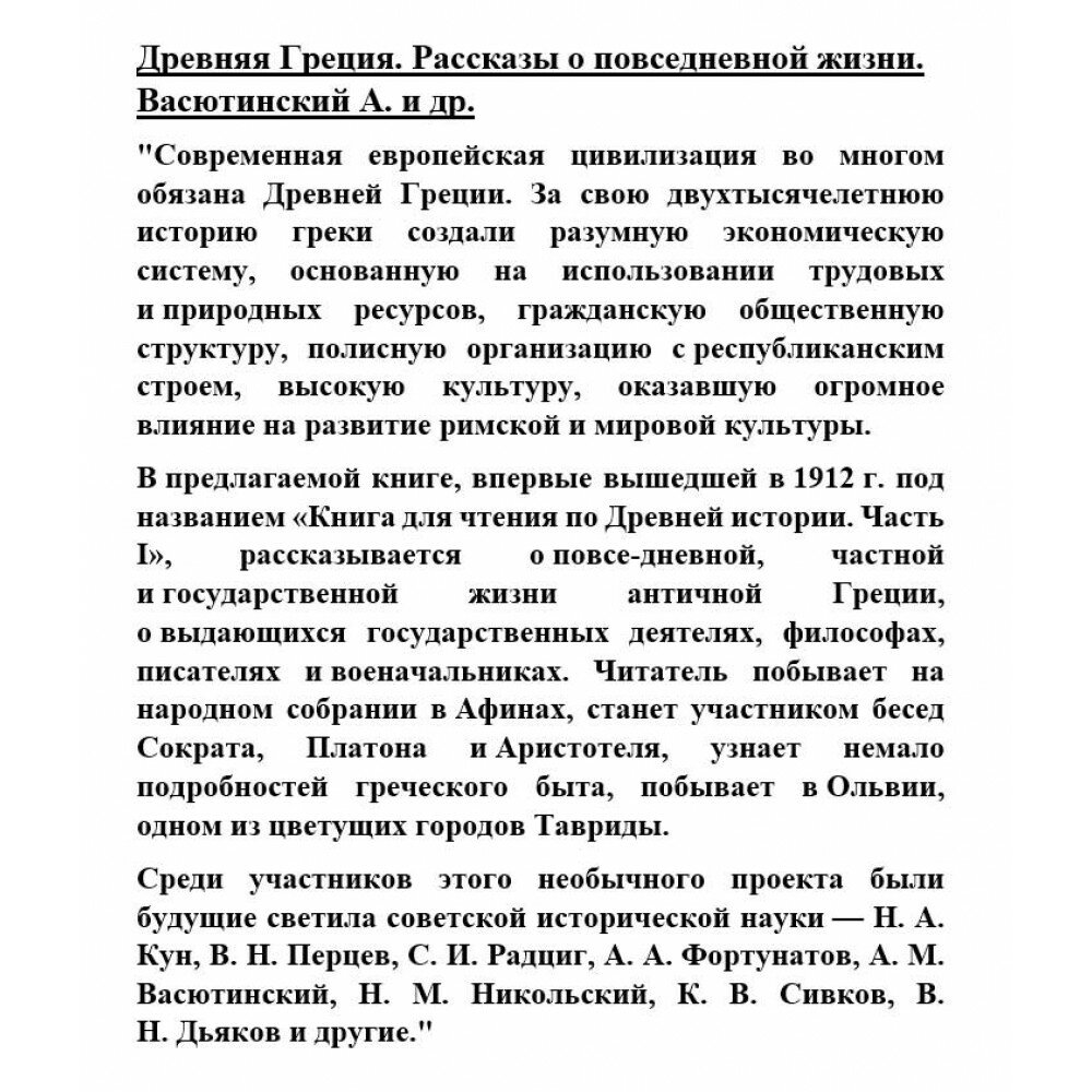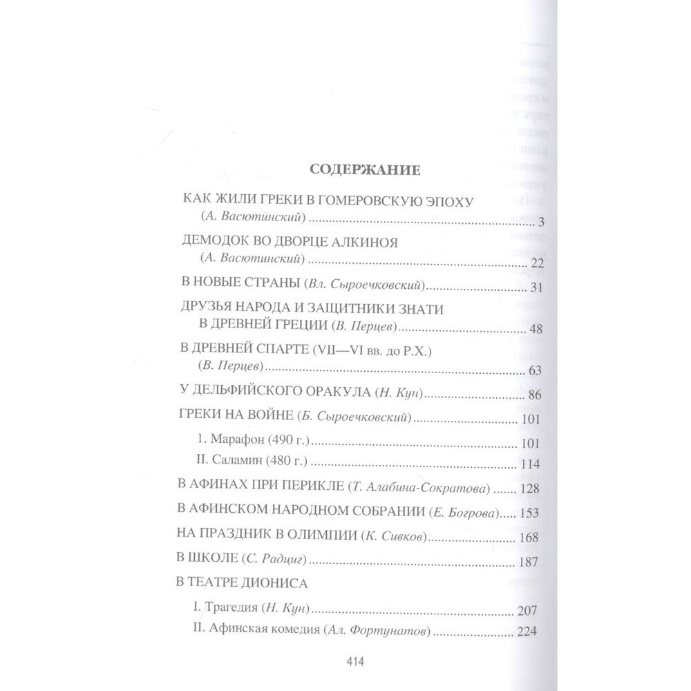 В предлагаемой книге, впервые вышедшей в 1912 г. под названием "Книга для чтения по Древней истории. Часть I", рассказывается о повседневной, частной и государственной жизни античной Греции, о выдающихся государственных деятелях, философах, писателях и военачальниках. Читатель побывает на народном собрании в Афинах, станет участником бесед Сократа, Платона и Аристотеля, узнает немало подробностей греческого быта, побывает в Ольвии, одном из цветущих городов Тавриды.