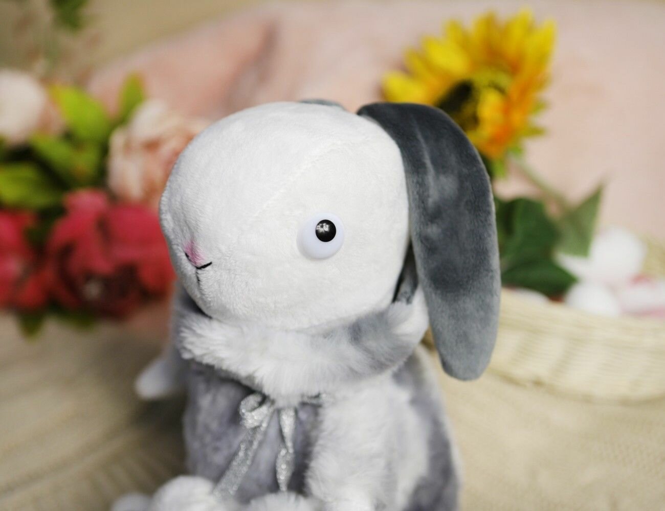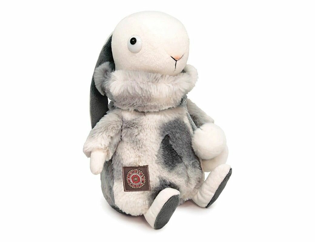 Кролик Нейл в оригинальной, несъемной шубке из мягкого меха в бело серебристых пятнах, украшенной двумя объемными белоснежными помпонами на серебристой ленте.