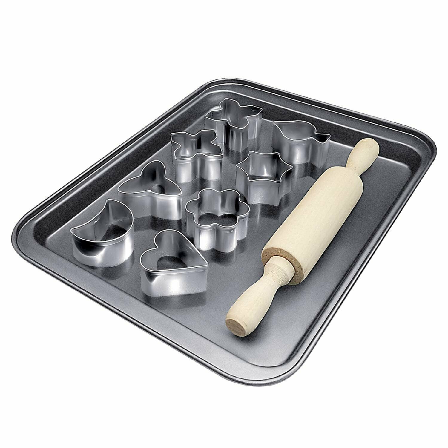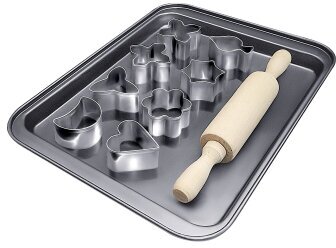 Набор для выпечки Linea Easy «Начинающий кулинар» рекомендуется для пряничного и песочного теста. В набор входят противень, фигурные формы для вырезки и скалка. Равномерное и быстрое прогревание способствует лучшему пропеканию пищи. Благодаря высокой прочности набор прослужит долго.Размер — 24х18 см.