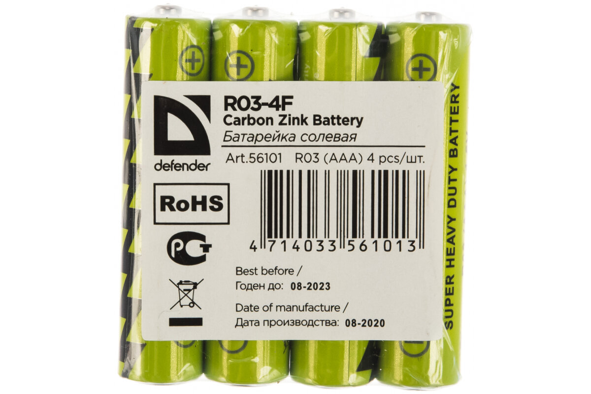 Defender R03-4B - батарейки, которые помогут поддерживать работу всевозможных полезных вещей, окружающих нас. Они выполнены из высококачественных материалов с использованием передовых технологий производства, обеспечивающие высокую эффективность их работы, а также долговечность службы.