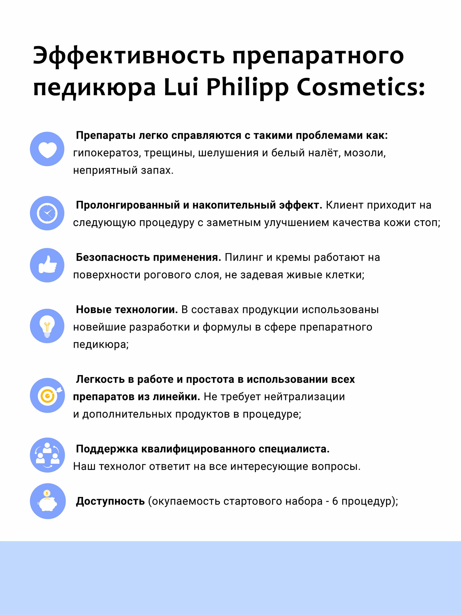 • Важно завершить услугу профессионального препаратного педикюра правильным средством, чтобы прежде всего защитить кожу и снизить чувствительность к воздействию окружающих факторов, а также запустить в эпидермисе процессы восстановления клеток;