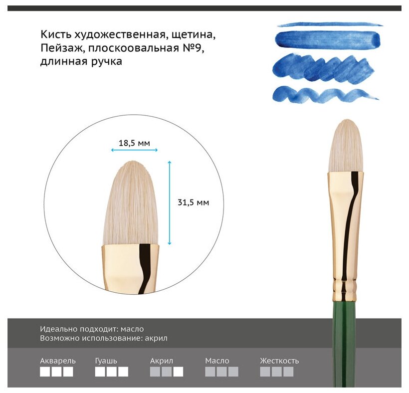 Кисть щетина №9 овальная Гамма "Пейзаж" длинная ручка (ГМ-604009)