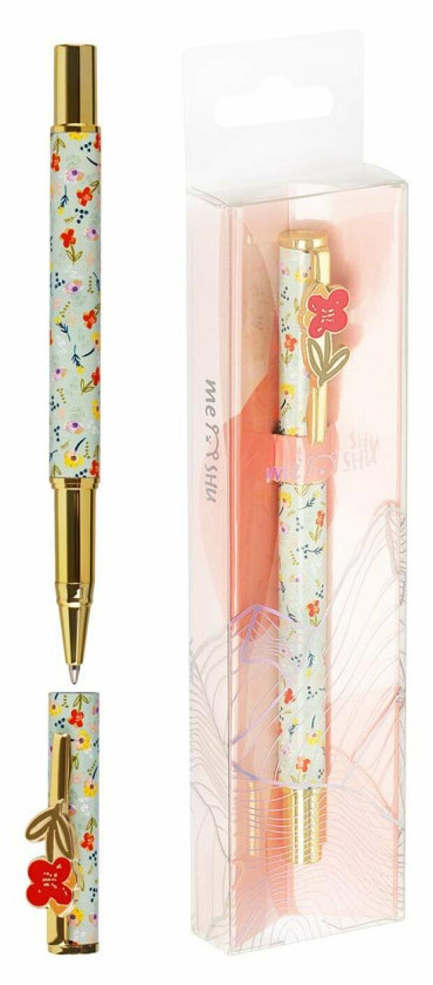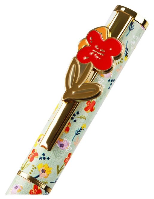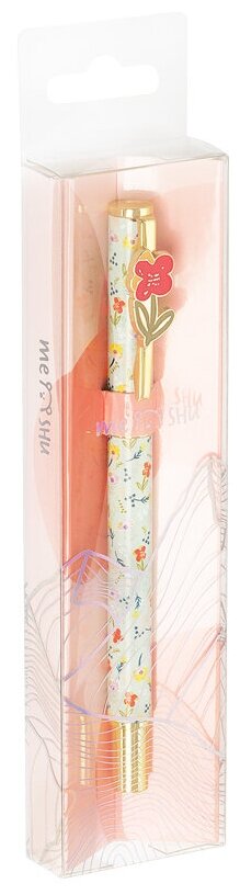 Шариковая ручка MESHU – это привлекательный аксессуар для ярких, смелых и успешных. Пастельно-зеленый корпус ручки с паттерном из луговых цветов из металла украшен ярким цветком на клипе, с помощью которого ручку можно закрепить на одежде или ежедневнике.