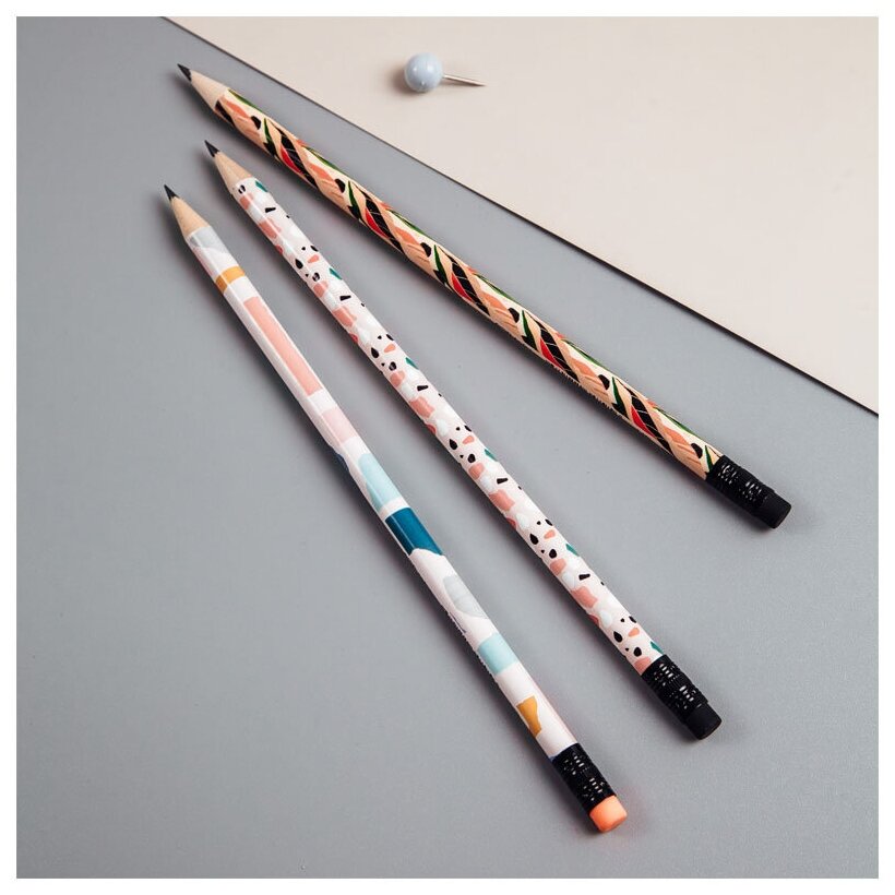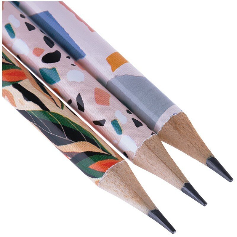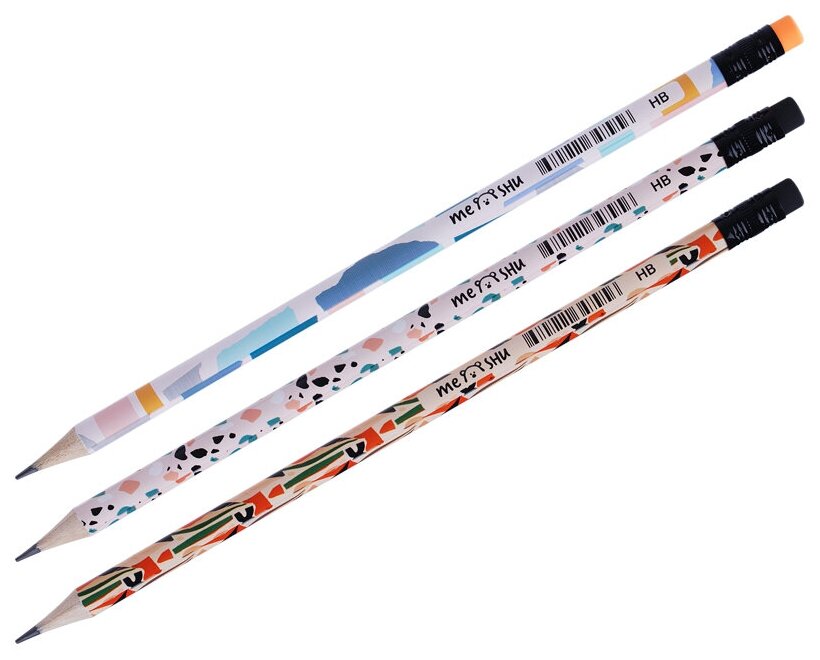 Набор чернографитных карандашей MESHU с печатью на корпусе и ластиком станет лучшим помощником в школе или офисе. Карандаши представлены в круглом корпусе в трёх разных дизайнах и упакованы в пакет с европодвесом. Твердость грифеля – HB, диаметр – 2,2 мм, длина карандаша – 190 мм. Изготовлены из светлого дерева. В наборе 3 карандаша.