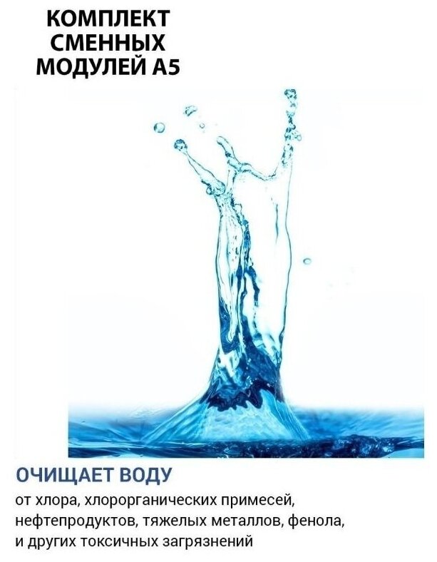 Картридж A5 создан специально для сложной водопроводной воды: ржавой, мутной, с большим количеством механических примесей. Даже в таких условиях A5 не забивается раньше времени, и продолжает очищать вашу воду от хлора и других растворенных примесей.