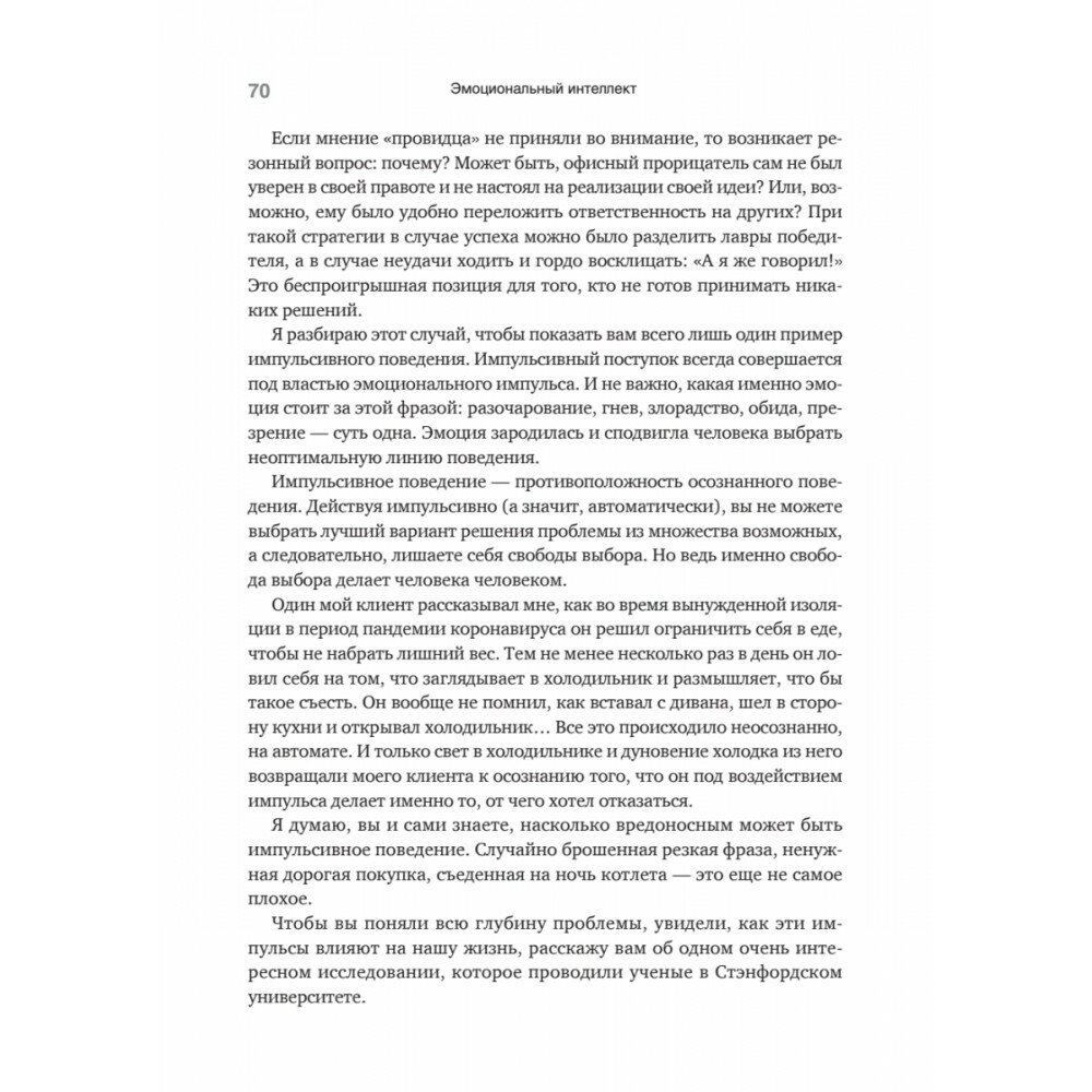 Раньше думала, что «эмоциональный интеллект» это больше про эмпатию и умение находить подход к разным людям. Недавно наткнулась на эту книгу, прочитала про «избавление от тревоги» и решила, что нужно попробовать. И сейчас могу уверенно сказать, что вещь рабочая. Особенно мне понравилось про контроль над импульсом. Автор и дает примеры, как механизмы психики работают в реальной жизни, и объясняет как все работает с точки зрения физиологии, и приводит упражнения для проработки навыков. Времени выполнять их у меня особо нет, но даже без них я понимаю, что справляться со стрессом стало легче. Думаю, сейчас эта книга пригодится многим. В общем, однозначно рекомендую.