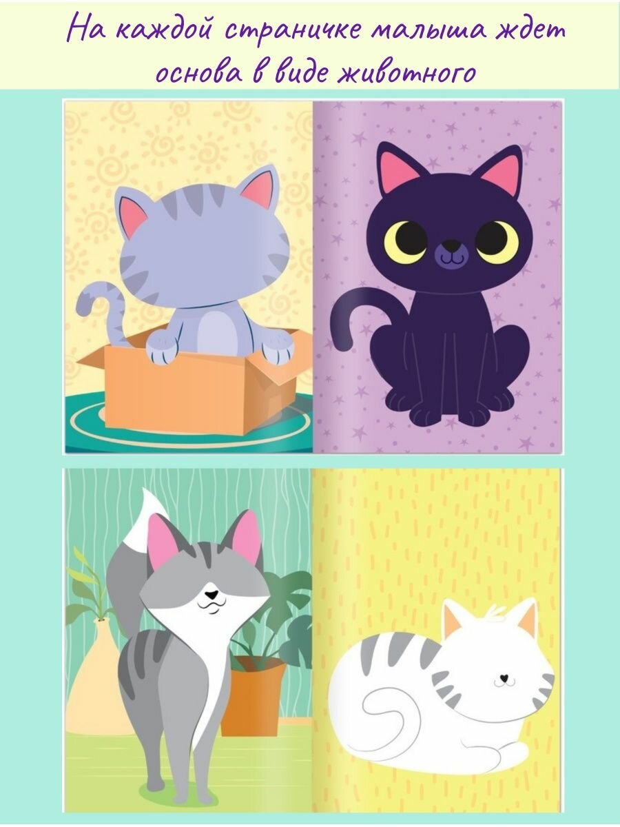 На каждой страничке малыша ждёт основа в виде животного. Задача малыша — приклеить стикеры с глазками, ртом и аксессуарами.