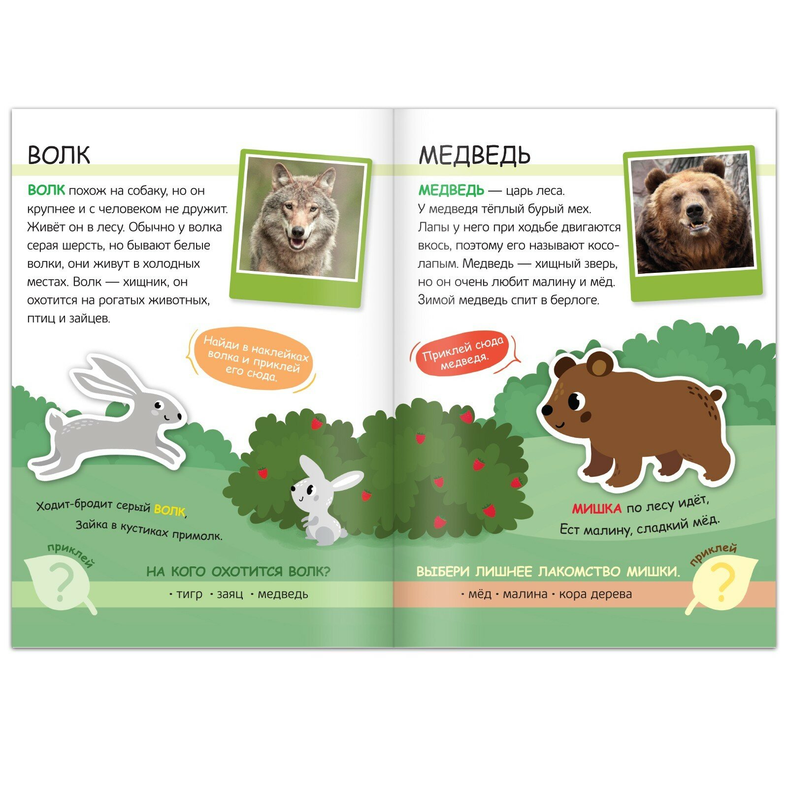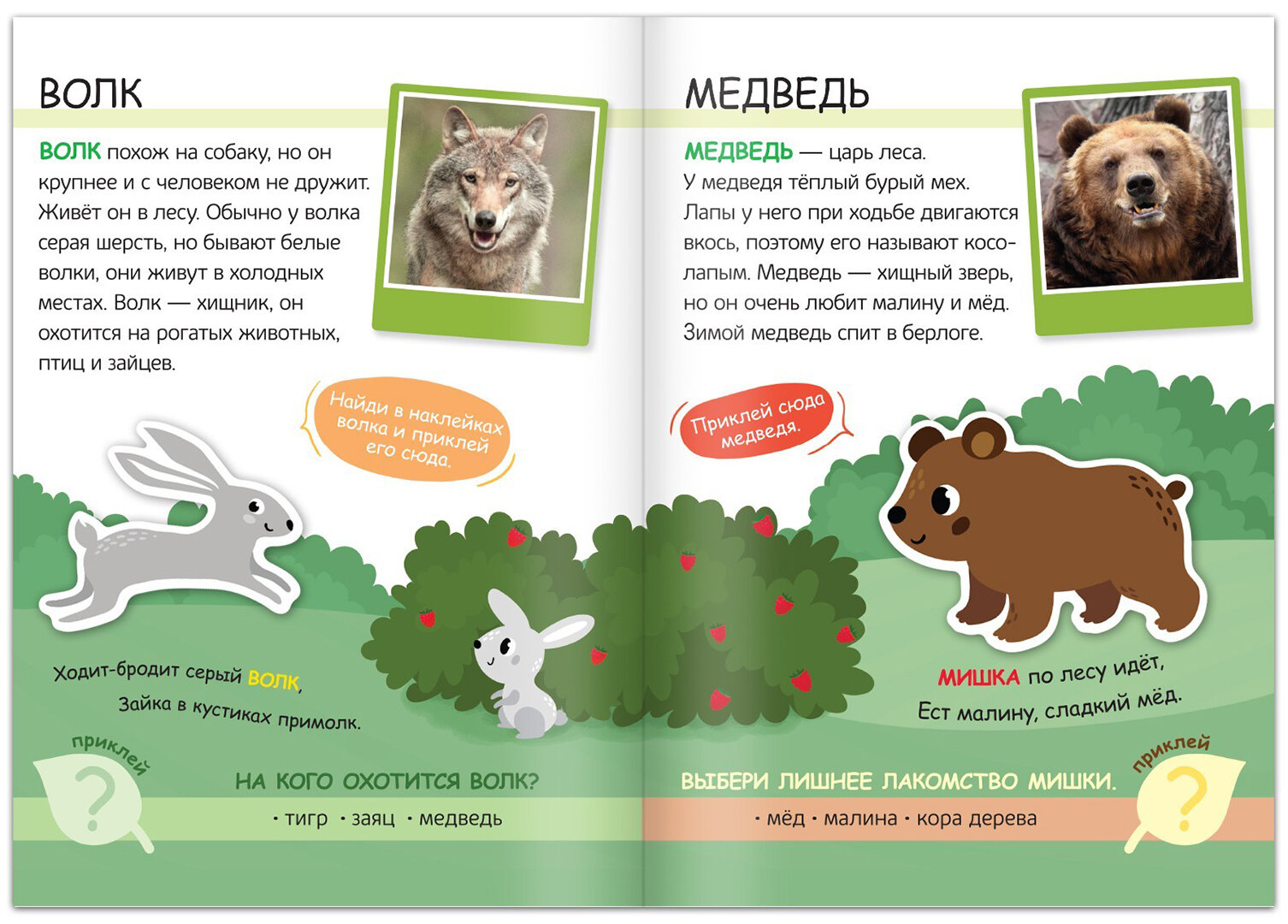 Каждая страничка книги посвящена своему герою. Читайте историю про лесного зверя, выполняйте задания и узнавайте больше о животных.