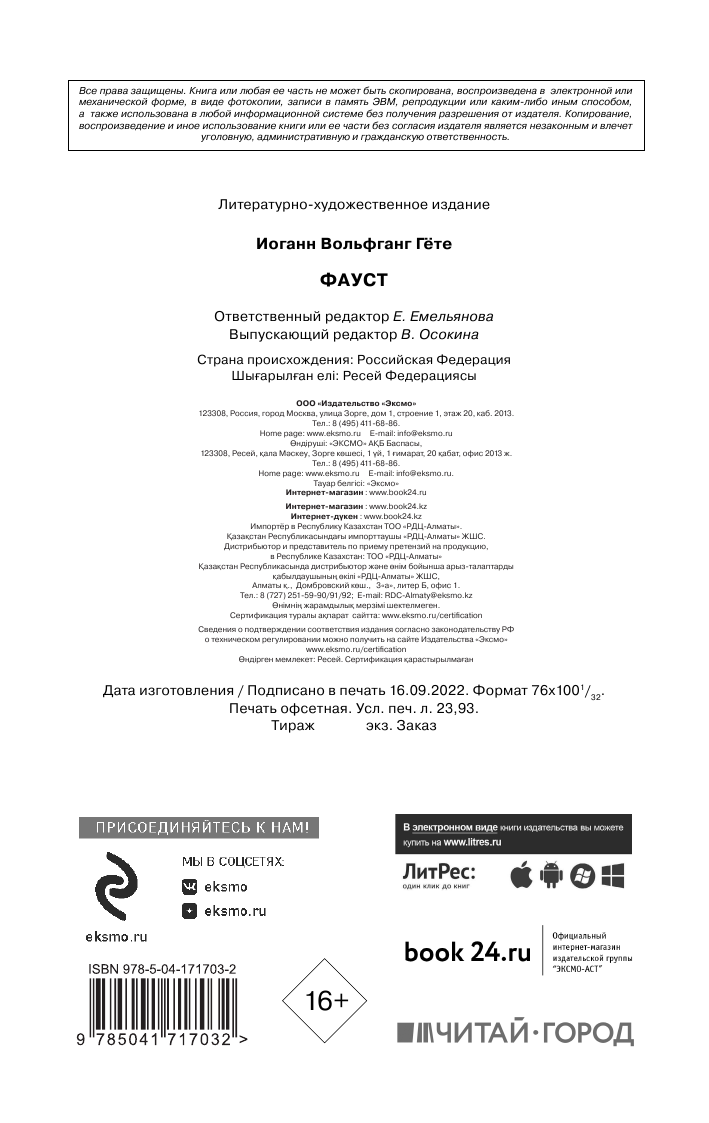 На сегодняшний день товар «Книга: Фауст (Гете Иоганн Вольфганг); ООО "Издательство "Эксмо", 2022» можно купить с кешбеком в 4 магазинах: Читай-город, book24, Яндекс.Маркет, Буквоед