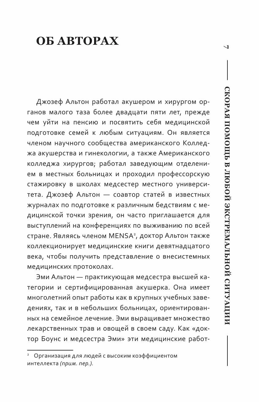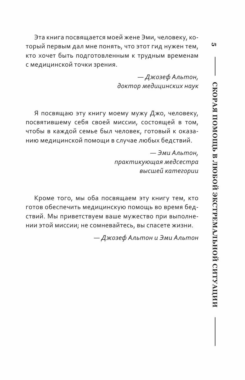 Книга написана лучшими экспертами в сфере подготовки к чрезвычайным медицинским событиям: Джозеф Альтон – доктор медицинских наук и Эми Альтон – практикующая медсестра высшей категории. Их миссия заключается в том, чтобы в каждой семье был человек, готовый помочь, когда нет возможности дождаться приезда скорой помощи. Полученный за десятилетия медицинской практики опыт, вошел в основу этой книги, весь представленный материал изложен доступным, понятным для любого читателя языком.