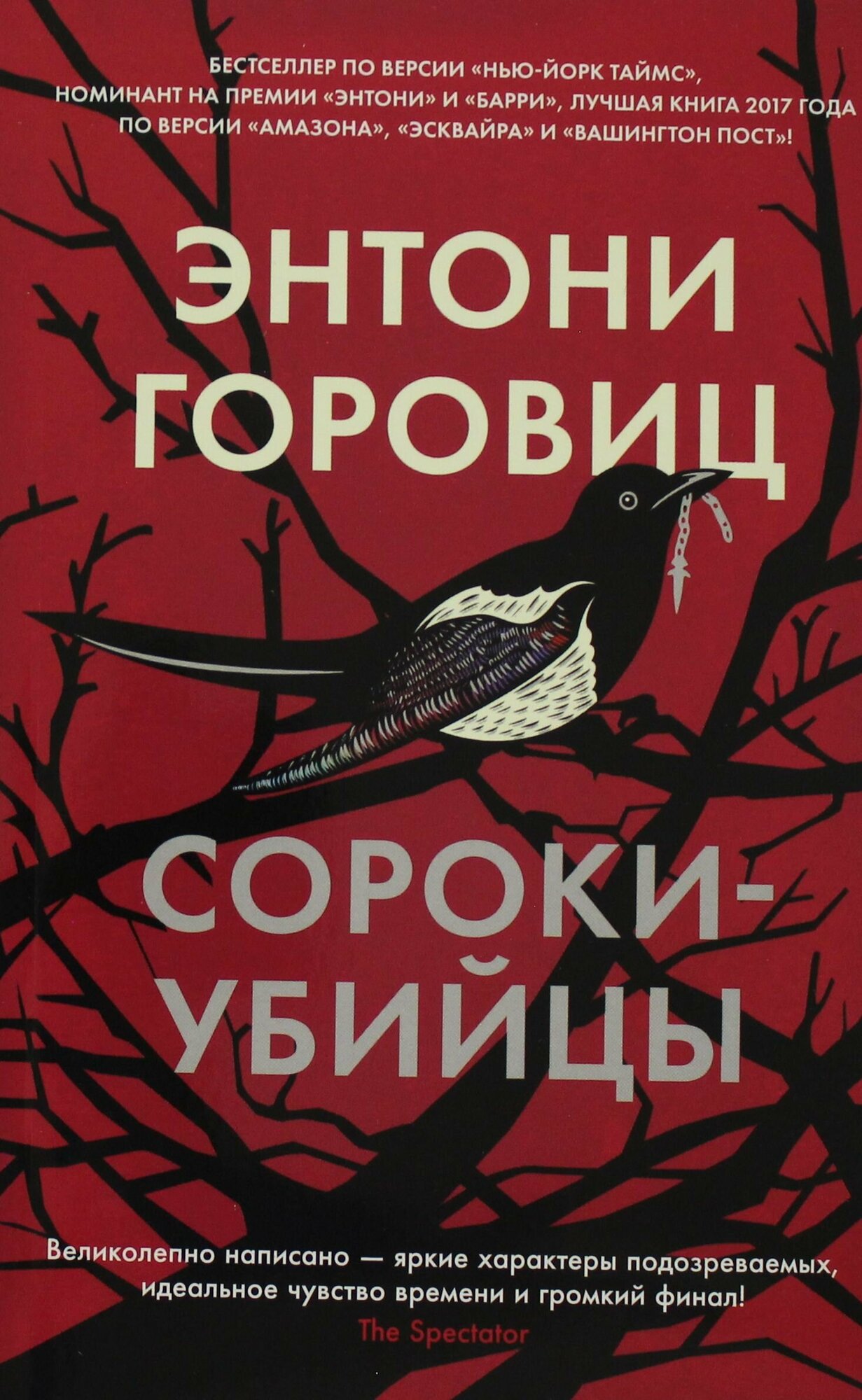 Отличная книга-детектив - загадка в загадке. Писатель Энтони Горовиц ранее знаком читателю по книге о продолжениях приключений Шерлока Холмса. В этой книге это сказывается - Сороки-убийцы - это книга по стилю, напоминающая рассказы о Шерлоке Холмсе Конан Дойла и романы Агаты Кристи. Книга держит в напряжении, трудно оторваться. Сюжет проработан очень хорошо. Читается легко. Книга карманного формата, в мягкой обложке, в дороге читать в самый раз. Есть эта книга и в твердой обложке обычного формата. Всем любителям детективов - советую обязательно прочесть. Автор талантливый.