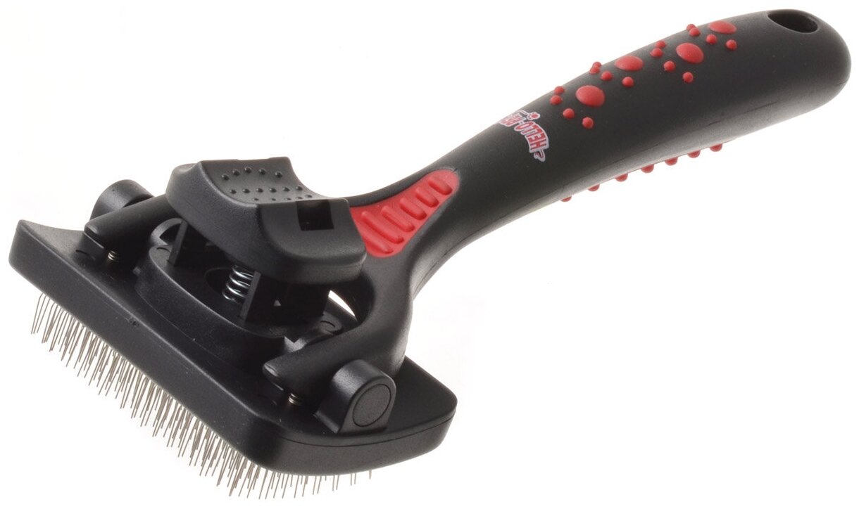 Пуходерка оснащена подвижной рабочей поверхностью, благодаря которой она принимает форму тела животного, делая процесс расчесывания комфортным и безболезненным. Она имеет частую тонкую металлическую щетину, которая избавляет от колтунов и спутывания, вычесывает выпавшую шерсть, делает ее пушистой и красивой, а также стимулирует рост новой шерсти. Щетинки расположены на воздушной подложке, снижающей усилия при расчесывании. Также пуходерка имеет автоматическую систему самоочищения, которая приводится в движение при нажатии на специальную кнопку. Эргономичная пластиковая ручка с прорезиненным вставками и упором для большого пальца очень удобна. Показать