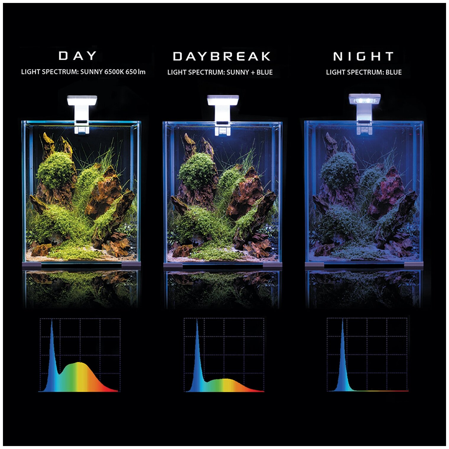 В комплект входит светодиодное освещение с тремя режимами: ДЕНЬ/РАССВЕТ/НОЧЬ; фильтр; нагреватель и покровное стекло.