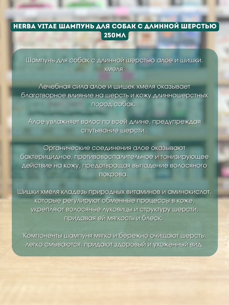 Сервис сравнения цен СкидкаГИД предлагает сравнить цены на товар «HERBA VITAE Шампунь с шишками хмеля и алоэ д/длинношерстных собак 250мл (31.3.223)»