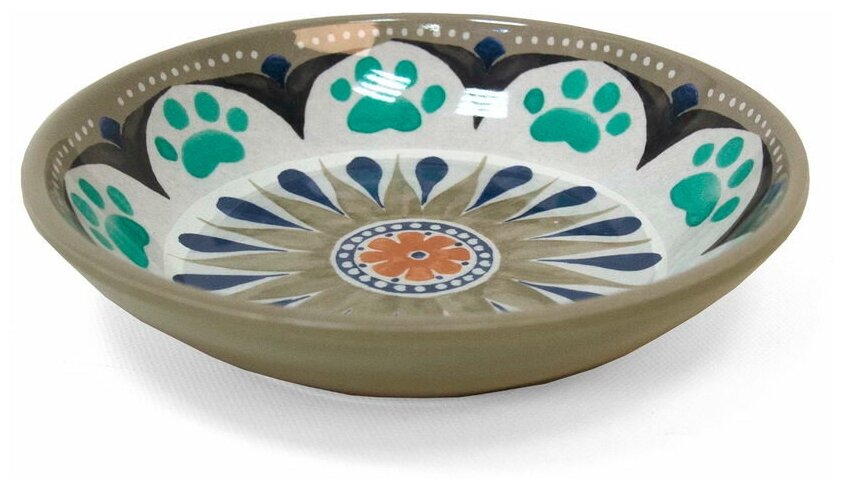 Стильная бежевая миска с принтом из отпечатков лапок и цветов. Такая миска станет прекрасным дополнением вашей кухни и обязательно понравится вашему питомцу. Миска изготовлена из меламина и обладает великолепными свойствами - особенная текстура и плотность этого материала обеспечивает стойкость к царапинам, предотвращает растрескивание и снижает ломкость, при этом сохраняется небольшой вес. Внешне изделия из меламина практически неотличимы от керамических и их можно мыть в посудомоечной машине. Для предотвращения скольжения и переворачивания на нижней части миски расположены специальные силиконовые вставки. Для большего удобства подъема и перемещения имеется выемка под руку.