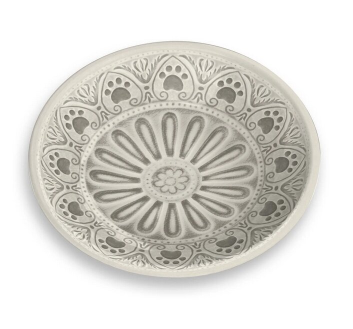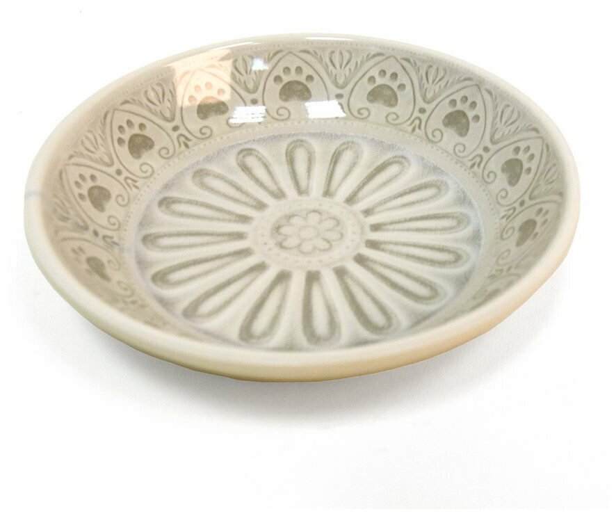 Элегантная неглубокая миска с нежным принтом из отпечатков лапок и растительных узоров. Рисунок выполнен максимально детально, вплоть до имитации растрескавшейся глазури, и не отличим от текстуры натуральной керамики. Миска выполнена из меламина и обладает великолепными свойствами - особенная текстура и плотность материала обеспечивает стойкость к царапинам, предотвращает растрескивание и снижает ломкость, при этом сохраняется небольшой вес изделия. Изделия из меламина можно мыть в посудомоечной машине, что значительно упрощает уход за ними. Также, на нижней части миски расположены силиконовые вставки, препятствующие скольжению и опрокидыванию.