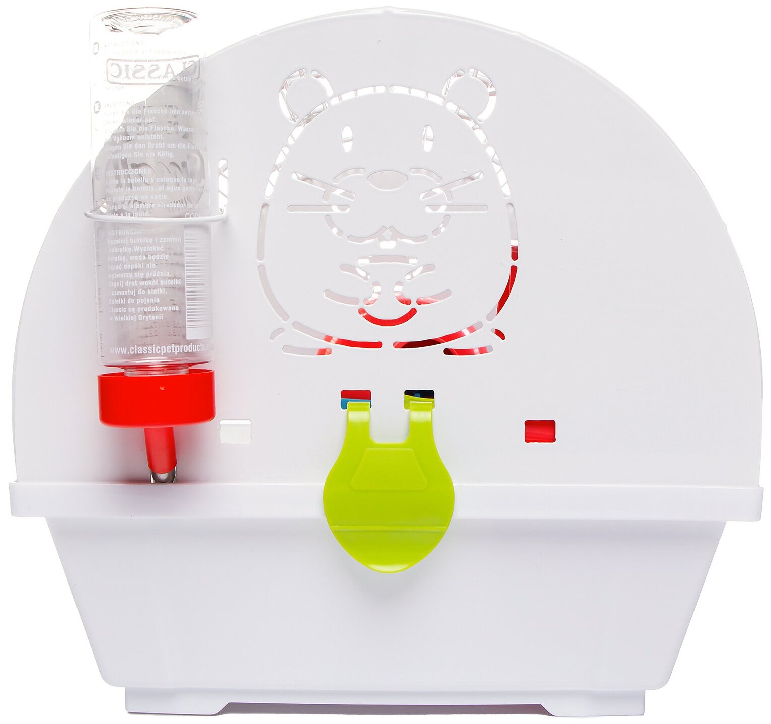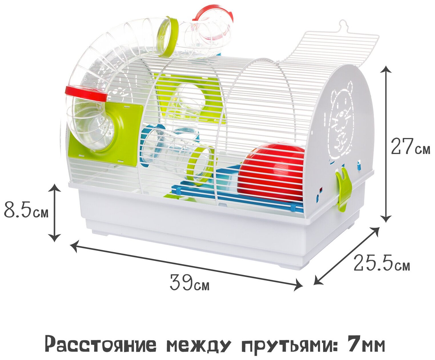 Боковые стенки из тонкой стали с перфорацией в виде забавных хомяков и высокий пластиковый поддон предотвращают разбрасывание наполнителя и мелкого мусора и создают для маленького обитателя атмосферу уюта и защищенности. Для свободного доступа к зверьку в верхней части решетки располагается одна дверка.