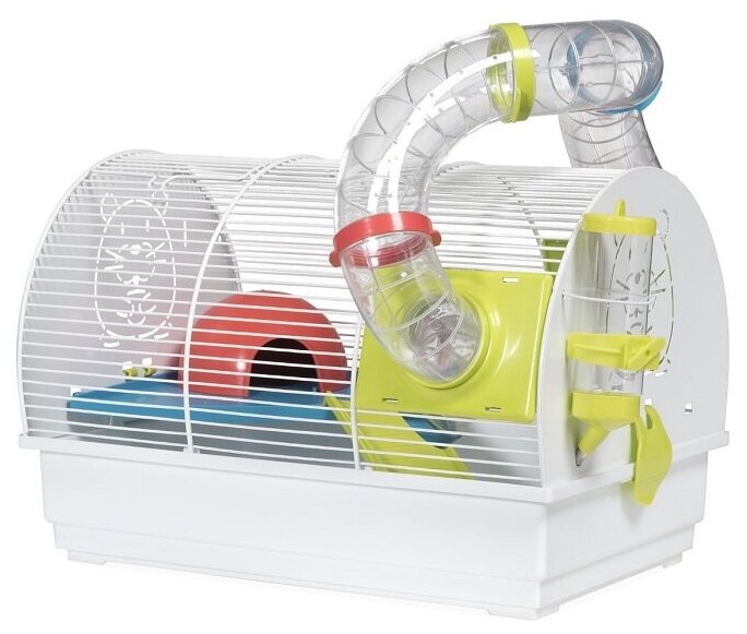 Внутреннее пространство разделено на два этажа за счет угловой полочки и ведущей к ней удобной лесенки. Для сна тут есть миниатюрный домик-иглу, а для интересного досуга – система тоннелей, выходящая за пределы клетки. Любой хомячок будет в восторге от такого дополнения, ведь узкий круглый коридор напоминает нору в земле, которые обычно роют грызуны в дикой природе. Бутылочка-поилка на 125мл с шариком в носике фиксируется снаружи, что не позволит питомцу свернуть или опрокинуть её.