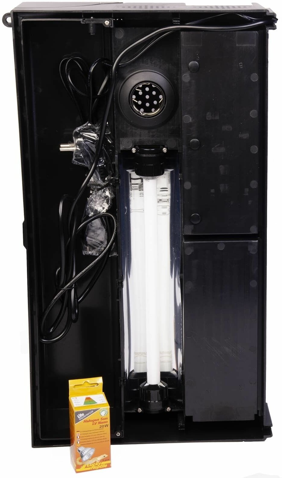 Полностью оборудованный стеклянный террариум для пустынных гекконов, белый, 50×28×40 см.Стартовый набор Lucky Reptile Starter Kit Desert Gecco для гекконов представляет собой комплект всего необходимого для обустройства жилища своему питомцу. Правильно подобранные и сочетаемые друг с другом компоненты подходят для моделирования среды обитания пустынного геккона. Комплект состоит из террариума, оснащённого проточной вентиляцией и крышкой. Крышку можно открывать, что делает процесс уборки и кормления более удобным. Она оснащена отверстиями для навесного замка, креплениями для систем осадков. Здесь же находится полость для хранения кабелей, шлангов.Освещение и обогрев обеспечиваются УФ-лампой Т5 (для получения необходимого количества ультрафиолета) и галогенной лампой (для получения тепла). В качестве почвенного наполнителя используется натуральный песчаный субстрат. Дополнительно в наборе находятся декоративные элементы, кормушка-поилка из синтетической смолы с небольшим пандусом для удобства доступа к чаше, задний фон двусторонний с фотографиями степной местности. Все элементы уникальны для каждого набора, поэтому изображения могут не соответствовать реальным комплектующим.Стартовые наборы Lucky Reptile Starter Kit актуальны для разведения животных в качестве хобби для тех, кто еще не сталкивался с миром террариумов, и доступны в белом и черном цветах.Параметры:Размер 50×28×40 см, цвет — белый, имеются отверстия в крышке для крепления лампы, навесного замка, систем осадков.Комплектация:Субстрат Lucky Reptile Desert Bedding 7 л, кормушка-поилка Water Dish Lava малая, фон двусторонний, декоративные украшения (3 вида), лампа Lucky Reptile UV Sun T5 8 Вт, лампа Lucky Reptile Halogen Sun LV Nano 20 Вт, брошюра о гекконах, инструкция в картонной коробке.