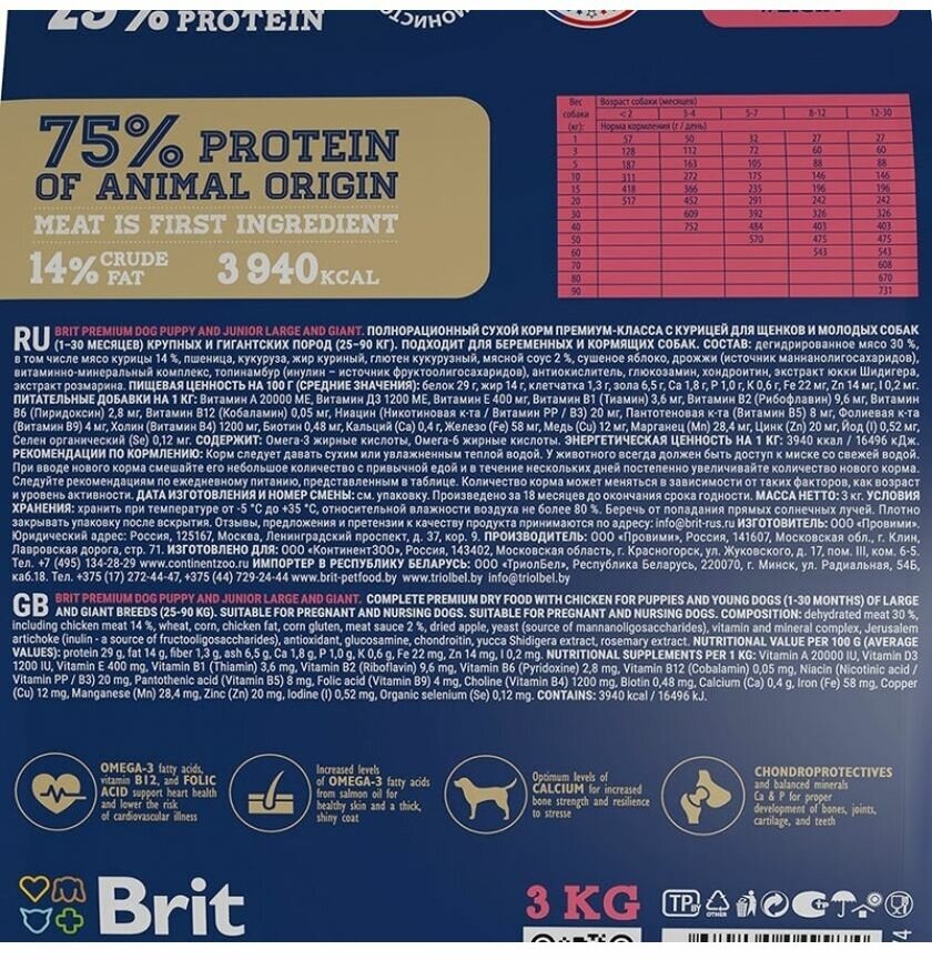 BRIT Premium Dog Puppy&Junior Large&Giant Корм сух.курица д/щенков и мол.собак круп/и гиган.пор.3кг (5049974)