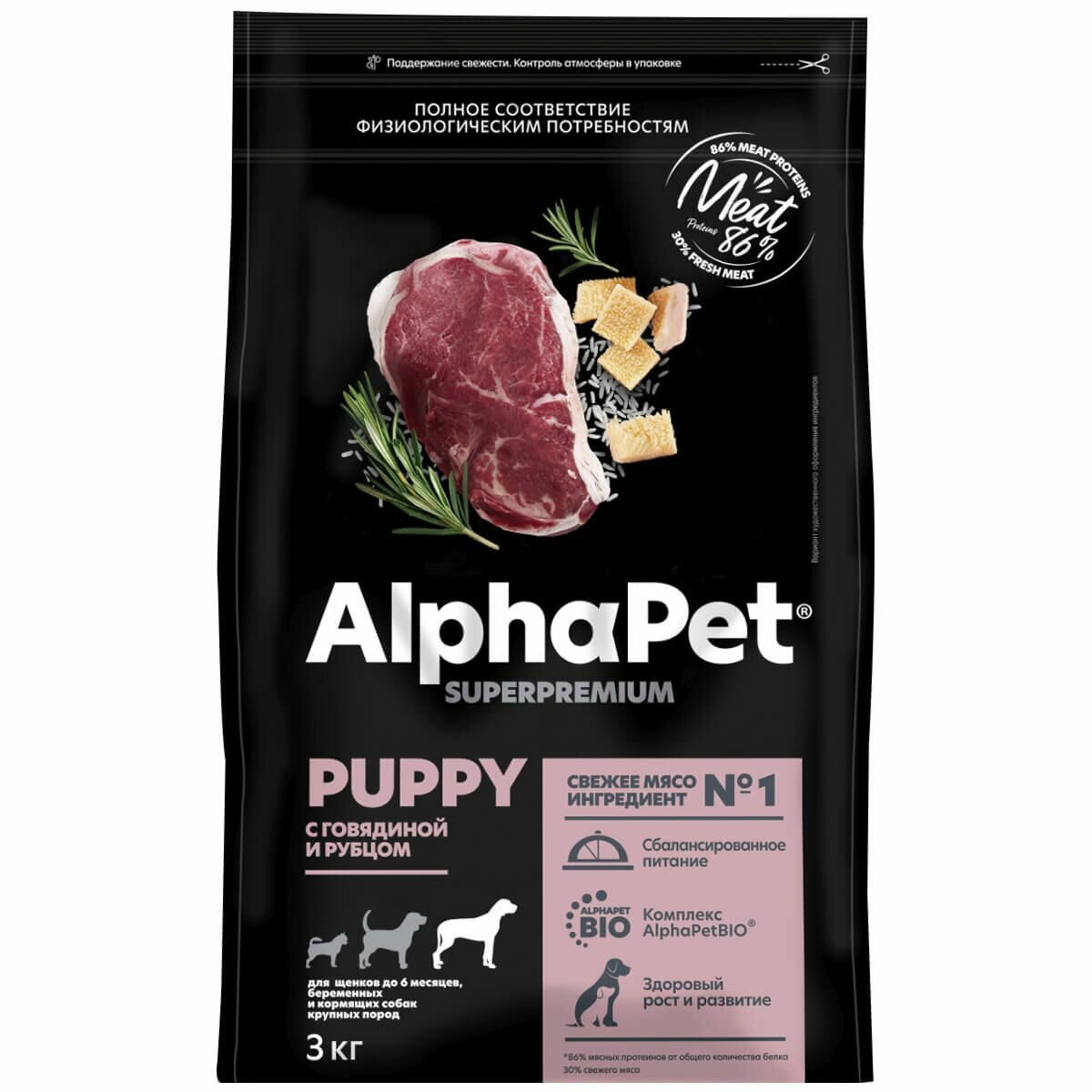 ALPHAPET SUPERPREMIUM 3 кг сухой корм для щенков до 6 месяцев беременных и кормящих собак крупных пород с говядиной и рубцом 1х3 (82978)