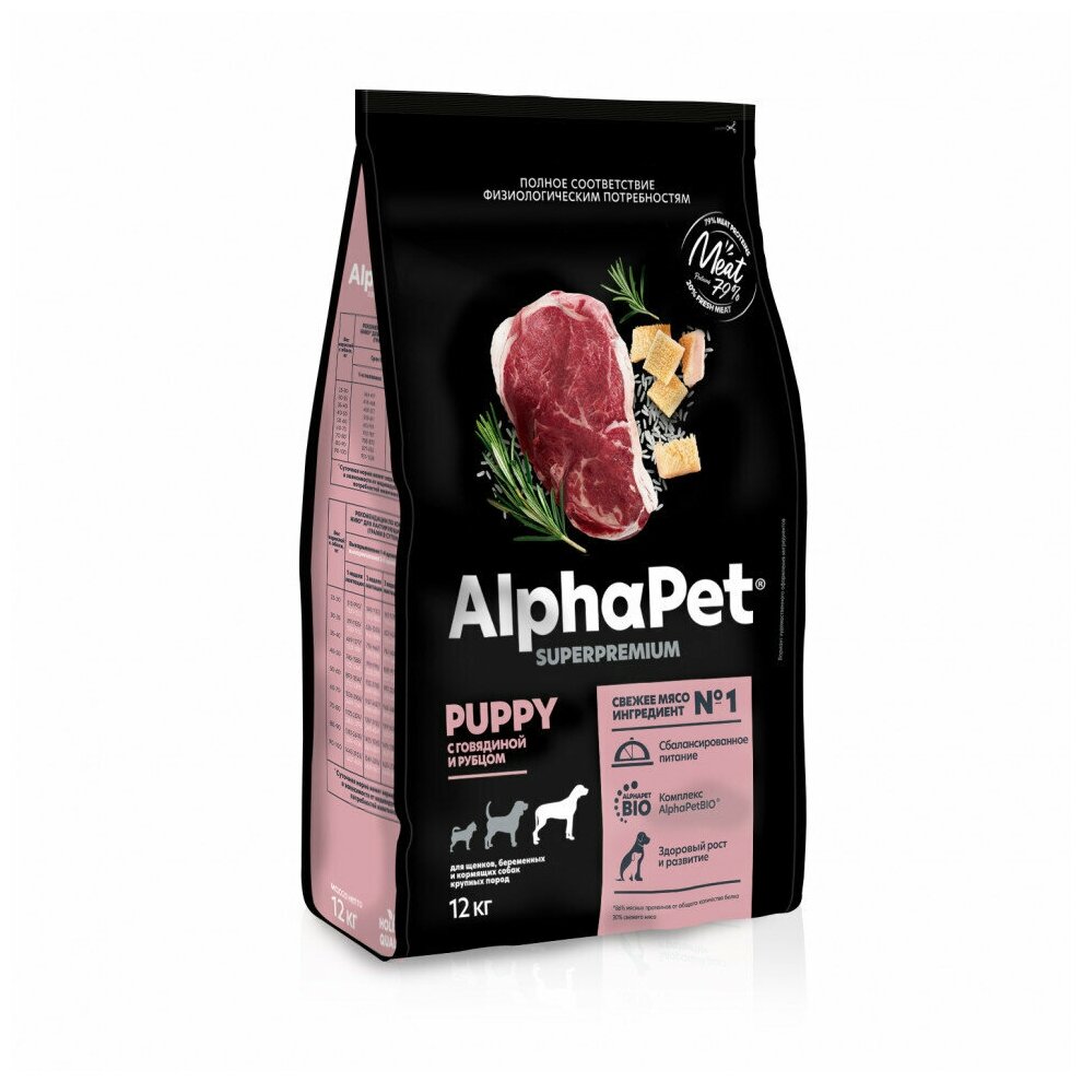 ALPHAPET SUPERPREMIUM 12 кг сухой корм для щенков до 6 месяцев беременных и кормящих собак крупных пород с говядиной и рубцом (82979)