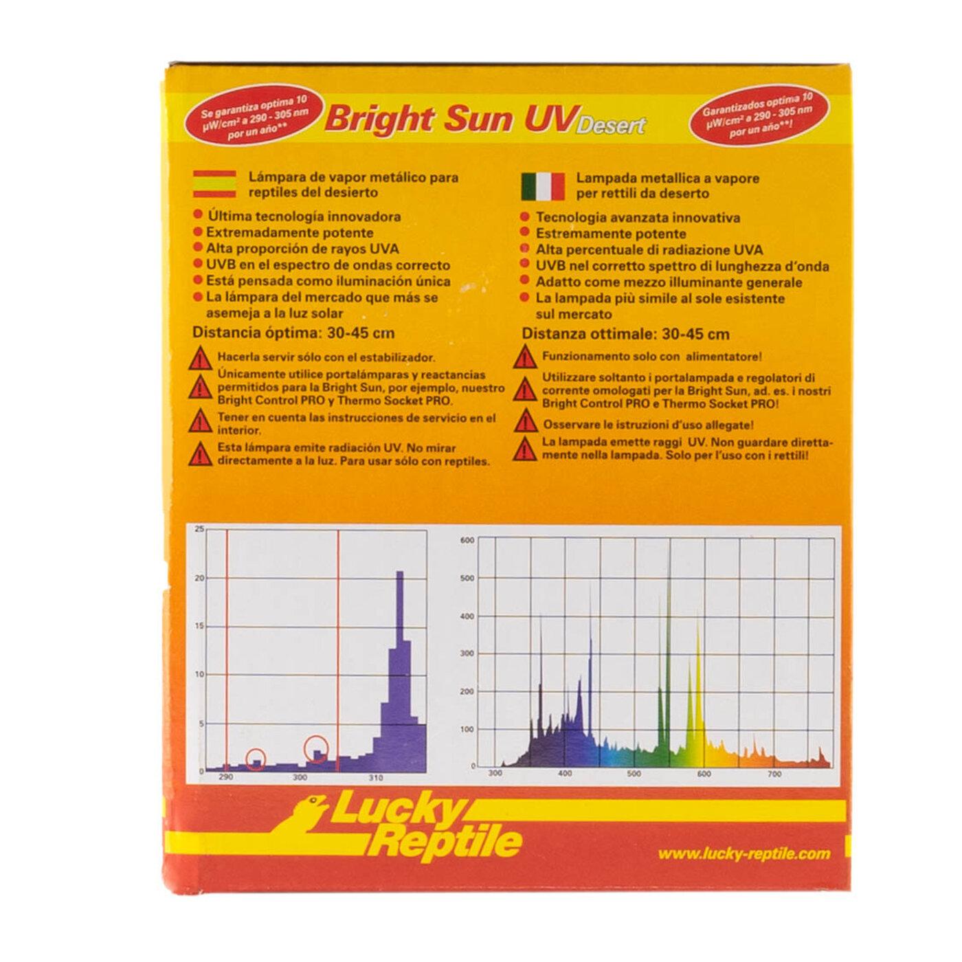 Эта лампа была специально разработана для рептилий, проживающих в пустыне, и нуждающихся в большом количестве ультрафиолета и тепла. По своим характеристикам лампа максимально приближена к настоящему солнцу. Лампы Bright Sun обеспечивают рептилий всем необходимым: ультрафиолетом, теплом, светом.