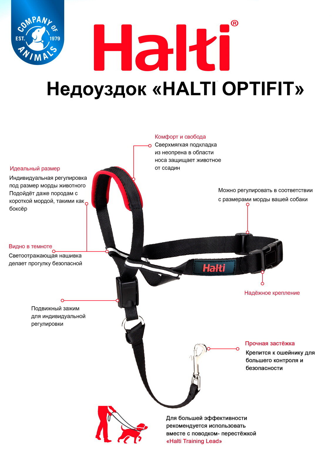 Для эффективного использования недоуздка Halti OptiFit необходим регулируемый поводок (поводок-перестежка) (в комплект не входит).