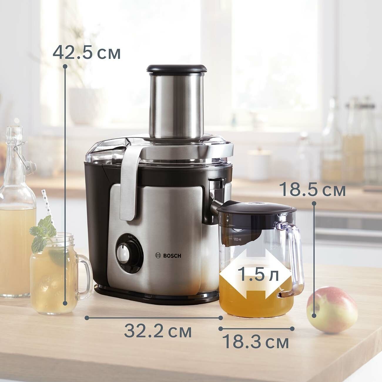 Удобная и простая в эксплуатации соковыжималка Bosch MES 4010 в стильном корпусе из литого алюминия, станет настоящим украшением вашей кухни. Прибор оснащен мощным мотором 1200 Вт и имеет три скоростных режима, благодаря чему позволяет эффективно отжимать соки из фруктов и овощей различной плотности, а широкая загрузочная горловина обеспечивает максимальный комфорт в использовании. Керамический нож и мелкоячеистое сито, обработанное методом электрополировки, предотвращают застревание волокон и мякоти, что облегчает очистку после использования. Функция SafetyStop автоматически отключает мотор соковыжималки при открывании крышки и не позволит включить прибор, если он неправильно собран, что гарантирует высокую степень безопасности.