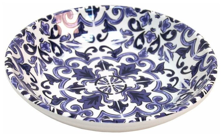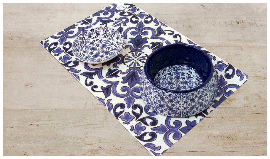 Стильная миска с принтом имитирующим восточную мозаику в сочных синих оттенках. Такая миска станет прекрасным дополнением вашей кухни и обязательно понравится вашему питомцу. Миска изготовлена из меламина и обладает великолепными свойствами - особенная текстура и плотность этого материала обеспечивает стойкость к царапинам, предотвращает растрескивание и снижает ломкость, при этом сохраняется небольшой вес. Внешне изделия из меламина неотличимы от керамических и могут мыться в посудомоечной машине. Для предотвращения скольжения и переворачивания на нижней части миски расположены специальные силиконовые вставки, а для большего удобства подъема и перемещения – выемка под руку.