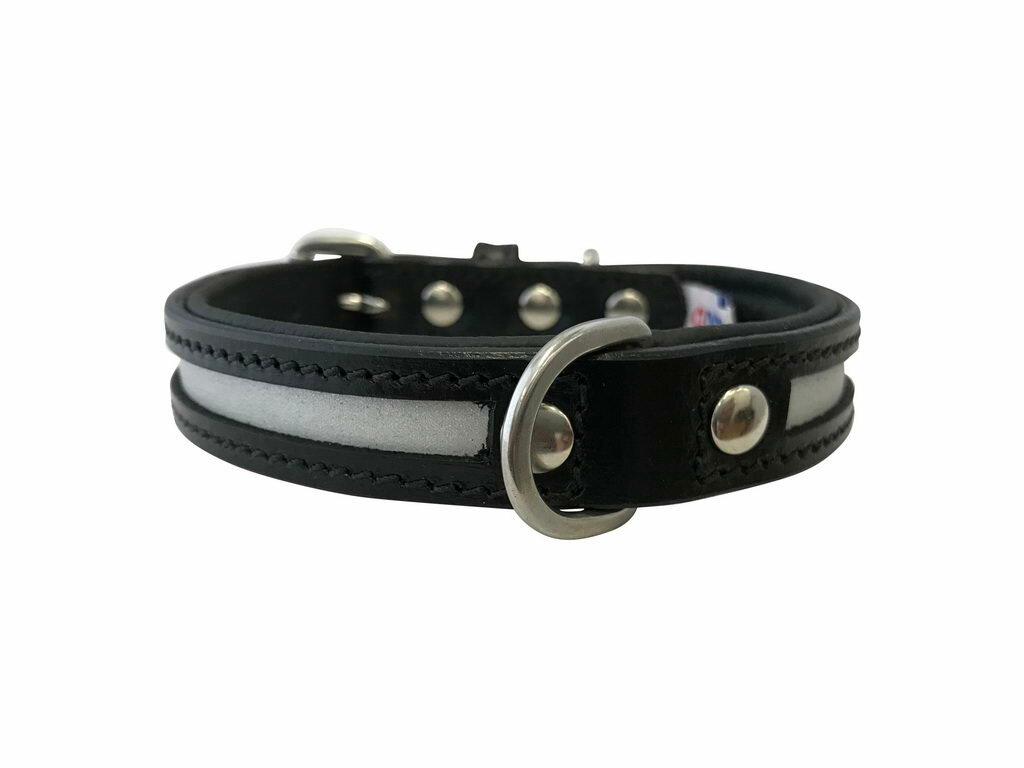 Кожанный ошейник "New York" со светоотражаюшей вставкой по всей длине, идеально подходит для прогулок в вечернее время, бега и любых других прогулок, требующих хорошей видимости.