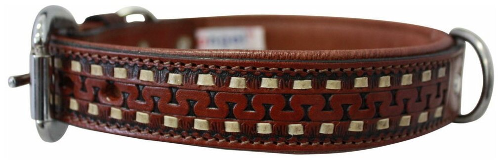 Эксклюзивная серия, дизайнерских кожаных ошейников. Каждый рисунок уникален - изготовление выполняется вручную. Красивое тиснение на коричневом фоне в виде двух рядов золотистых квадратов с узором между ними - станут самым изысканным украшением для вашего любимого питомца. Ошейник выполнен из телячьей кожи самого высокого качества. Модель оснащена хромированной сварной фурнитурой из нержавеющей стали. Качественные материалы позволят ошейнику прослужить долгие годы, питомец получит комфорт при его ношении.