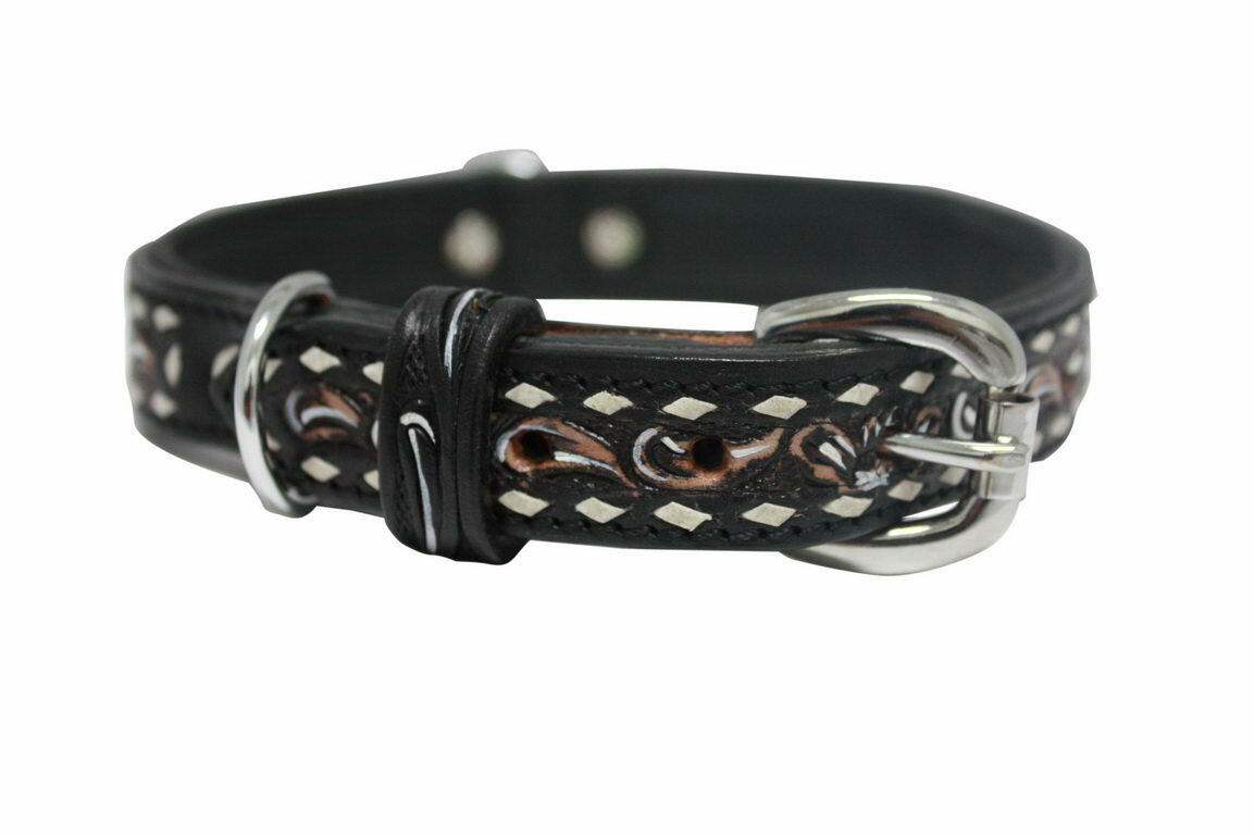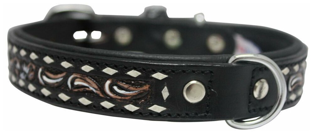 Ошейник «Laredo» для собак средних и крупных пород. Эксклюзивная серия, дизайнерских кожаных ошейников. Каждый рисунок уникален - изготовление выполняется вручную. Красивое тиснение на черном фоне в виде цветов с красивой рамкой - станут самым изысканным украшением для вашего любимого питомца. Ошейник выполнен из телячьей кожи самого высокого качества. Модель оснащена хромированной сварной фурнитурой из нержавеющей стали. Качественные материалы позволят ошейнику прослужить долгие годы, питомец получит комфорт при его ношении.