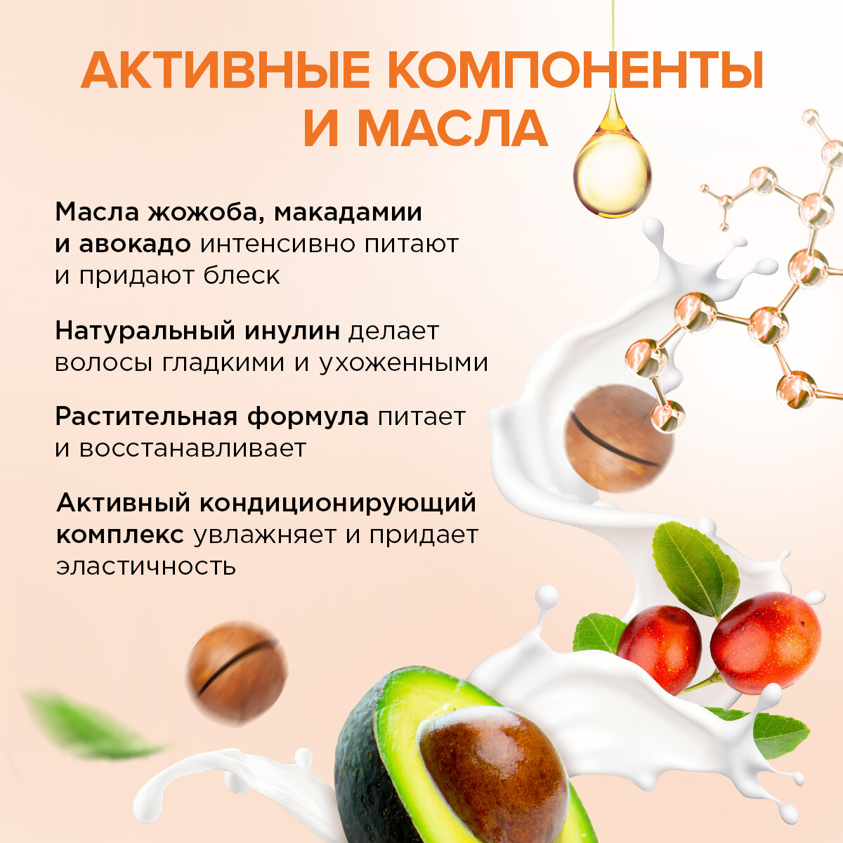 - Бальзам содержит масла жожоба, макадамии и авокадо, которые интенсивно питают и придают здоровый блеск волосам, а натуральный инулин делает их более гладкими и ухоженными.