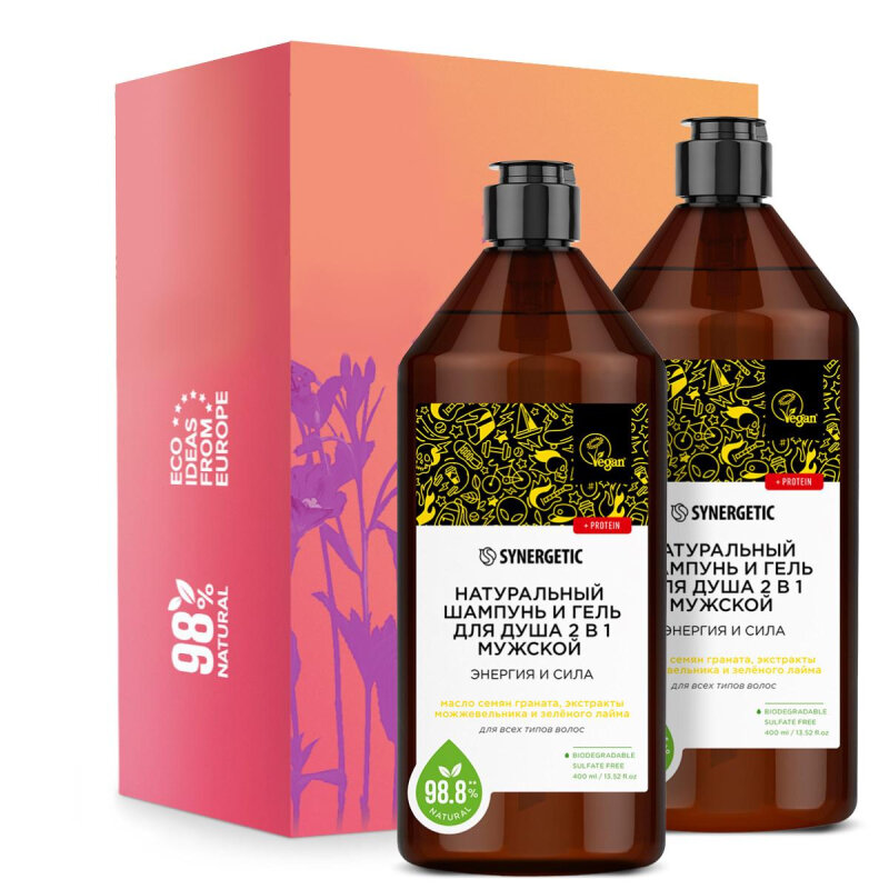 Натуральный бессульфатный шампунь и гель для душа 2 в 1 мужской «Энергия и сила» 400мл Synergetic