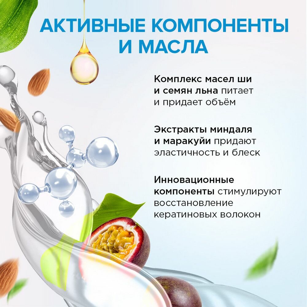 - Специально разработанная формула на основе масел ши и кокоса питает тонкие ослабленные волосы и увеличивает объем, а натуральные экстракты гуавы и маракуйи придают им эластичность и блеск;