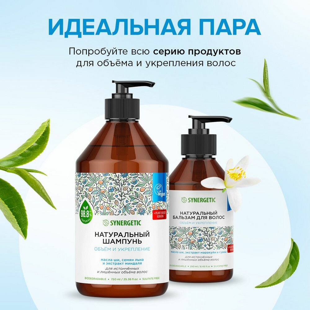 Натуральный бальзам для волос SYNERGETIC «Объем и укрепление» — эффективное средство для ухода за истонченными и лишенными объема волосами — более чем на 98% состоит из натуральных компонентов.