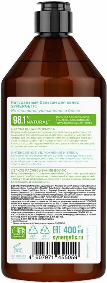 Натуральный бальзам для волос «Интенсивное увлажнение и блеск» 400мл Synergetic