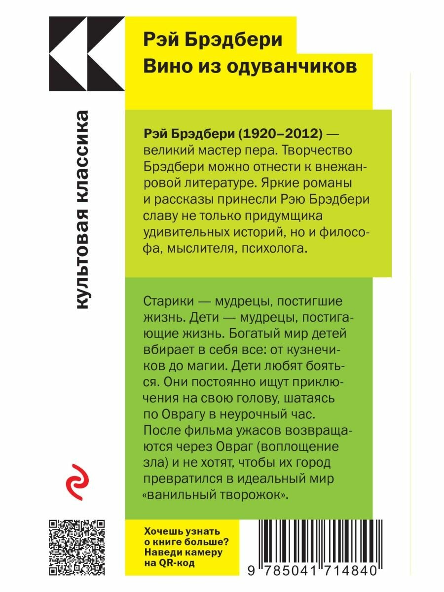 На сегодняшний день товар «Книга: Вино из одуванчиков (Брэдбери Рэй); ООО "Издательство "Эксмо", 2022» можно купить с кешбеком в 3 магазинах: Читай-город, book24, Буквоед