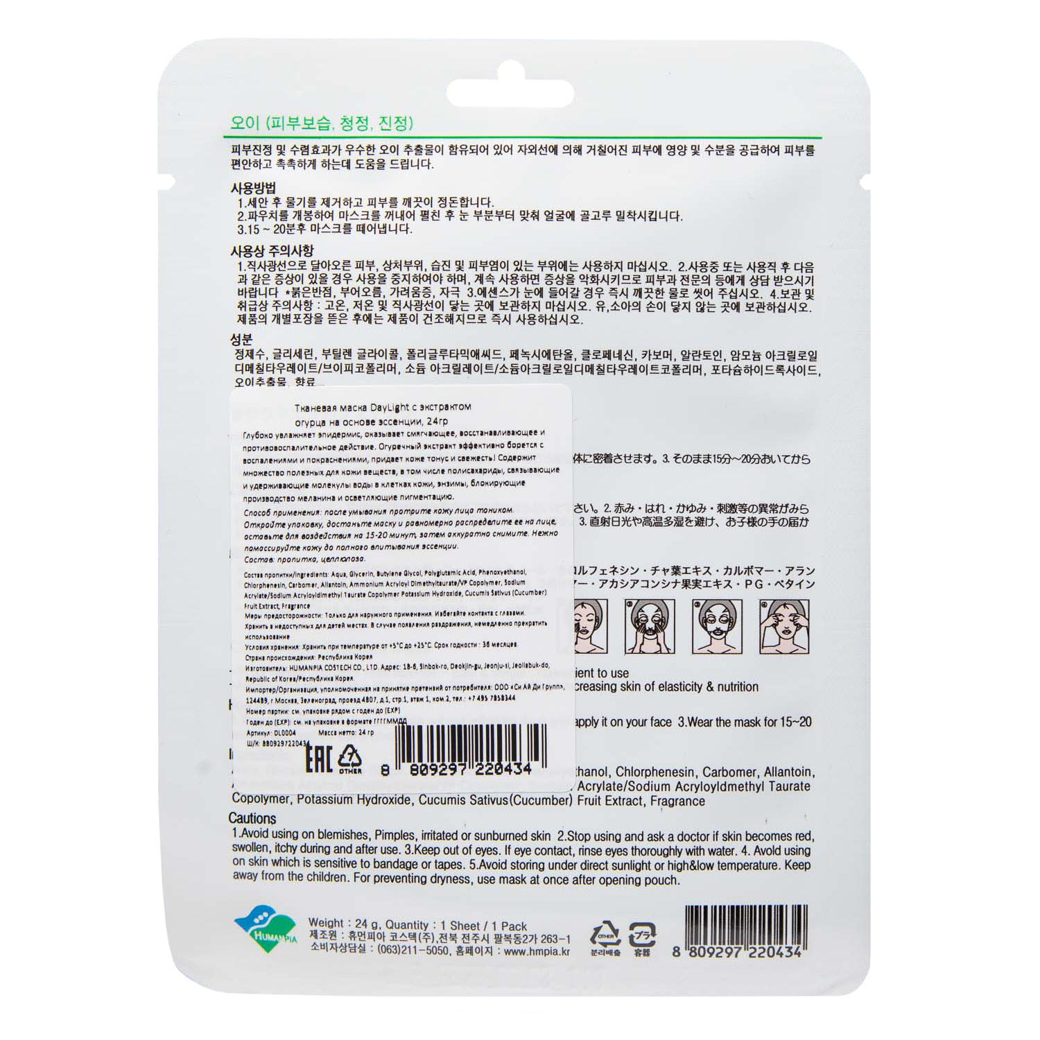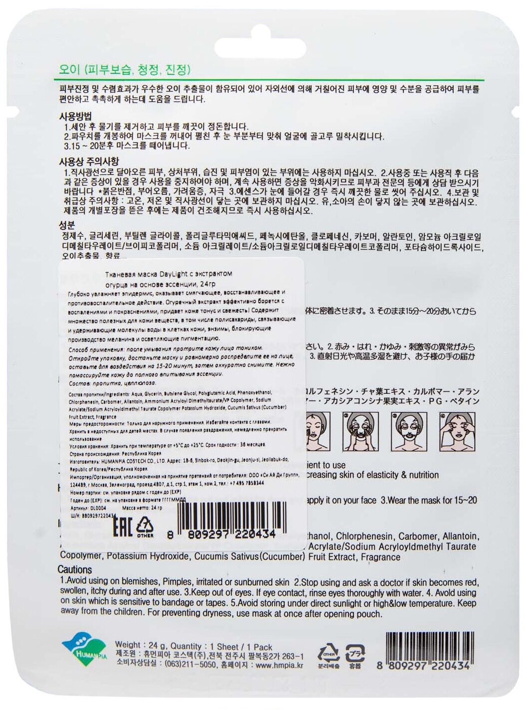 DAY LIGHT Тканевая маска с экстрактом огурца на основе эссенции 24 г (DAY LIGHT ) (ЭХ99989432714)