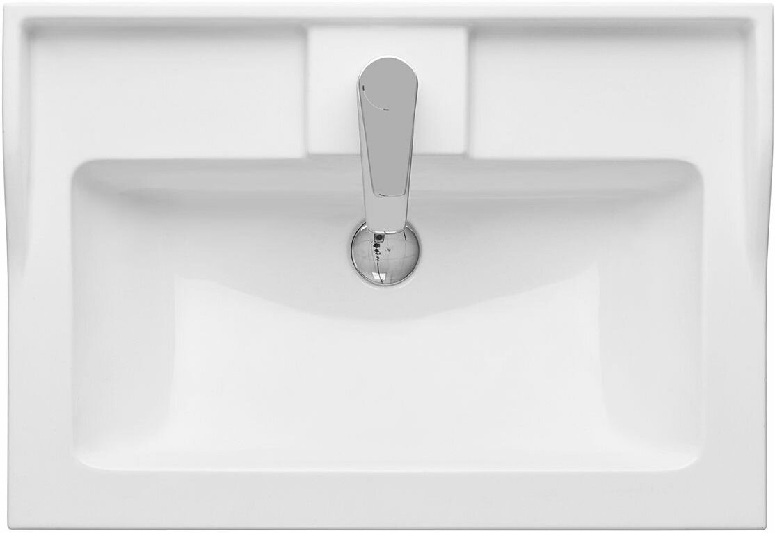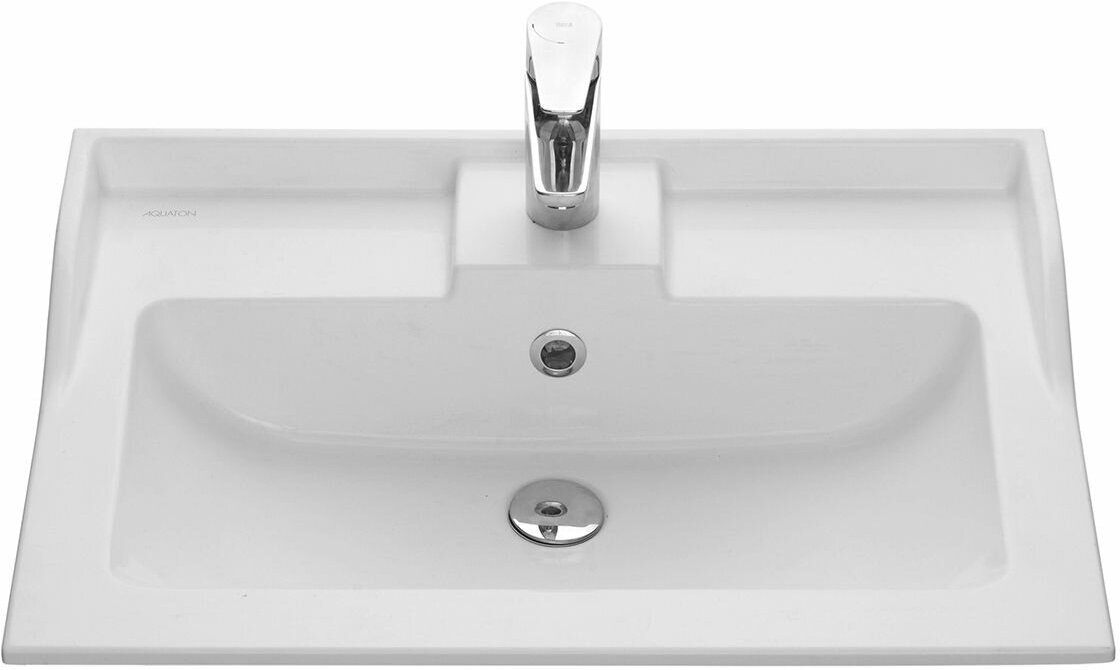 Поклонникам лаконичных решений наверняка понравится мебельная раковина Акватон Фабиа 650. Модель 1A708731FB010 представлена в традиционном белом цвете и обладает габаритами 65х45 см. Данное решение отличается строгостью форм и наличием невысоких защитных бортиков, которые исключают переливание воды за пределы умывальника. Чаша имеет среднюю глубину и оснащена отверстием для слива, перелива у этой модели нет. При желании на заднюю стенку по центру можно установить смеситель.