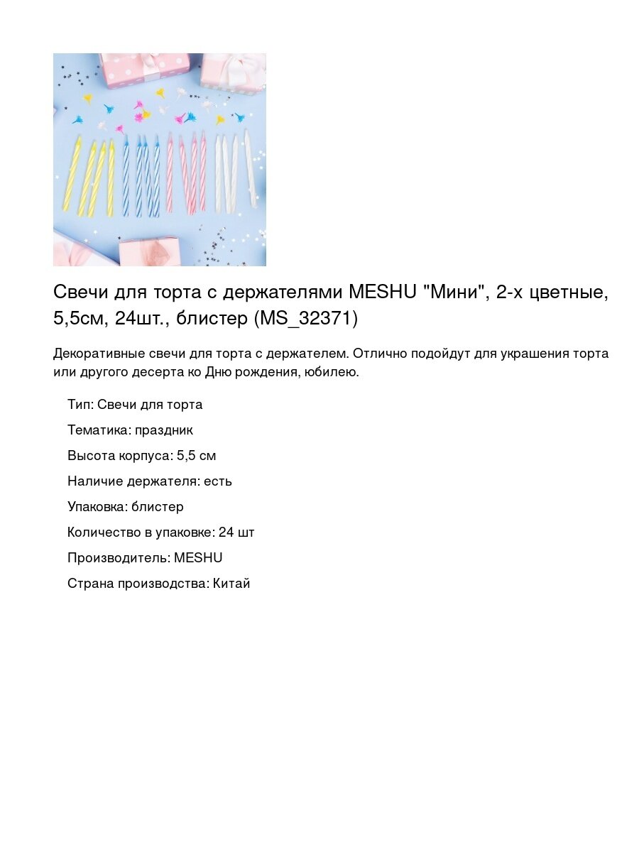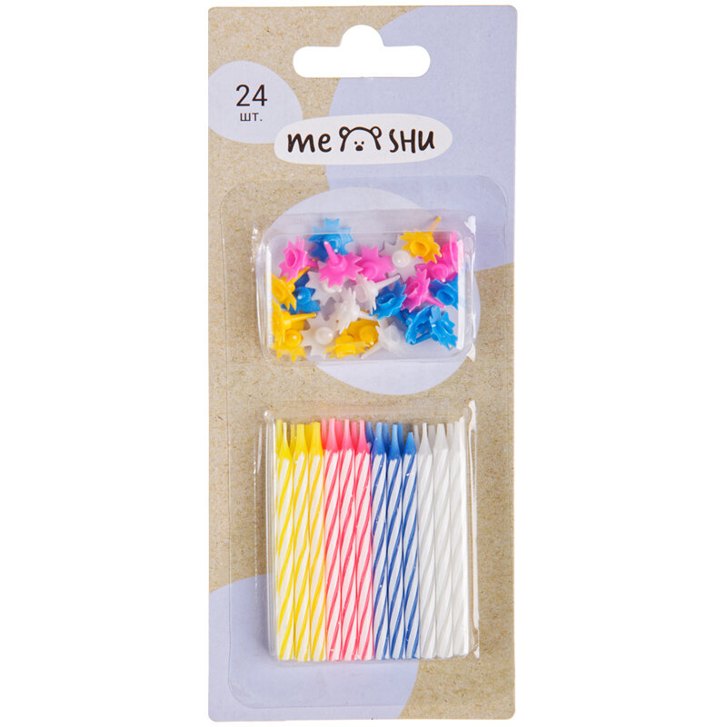 На сегодняшний день товар «Свечи для торта с держателями MESHU "Мини" 2-х цветные 55 см 24 шт блистер (MS_32371)» можно купить с кешбеком в 1 магазине: Арт-маркет "Красный Карандаш"