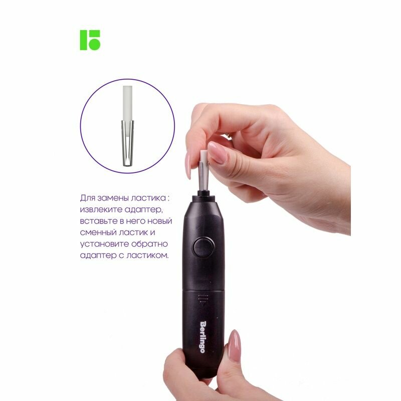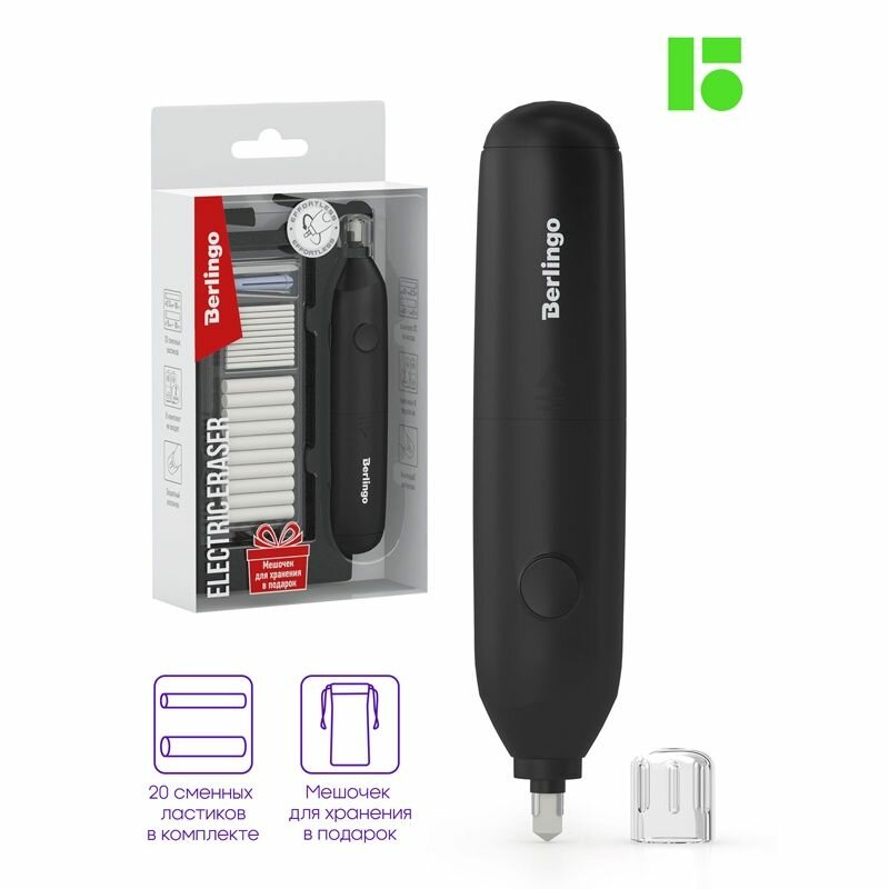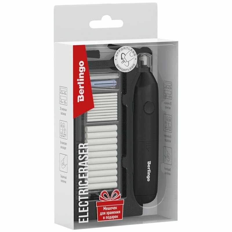 Электрический ластик Berlingo поставляется в PVC боксе с европодвесом. Мешочек для хранения идет в подарок!