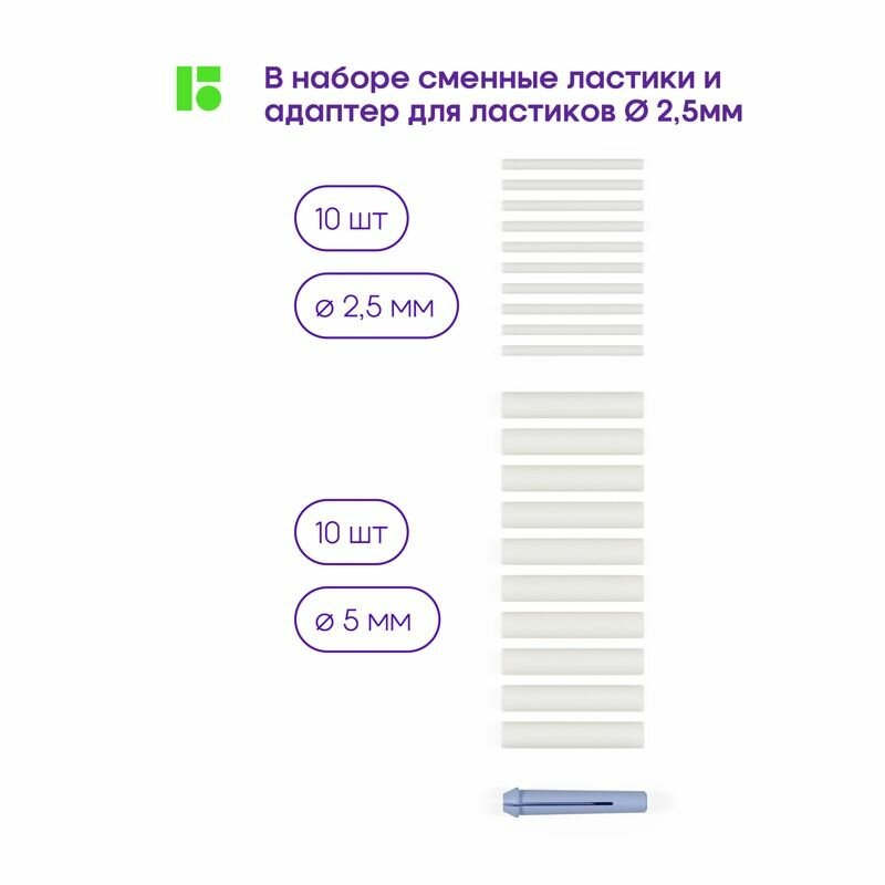 В комплекте 20 сменных ластиков разной толщины: 2,3мм - 10шт, 5мм - 10шт.