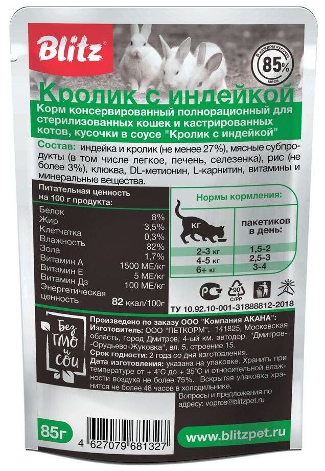 BLITZ Sensitive Sterilised Корм влаж.кролик с индейкой кус.в соусе д/стерилизованных кошек пауч 85г (81334)