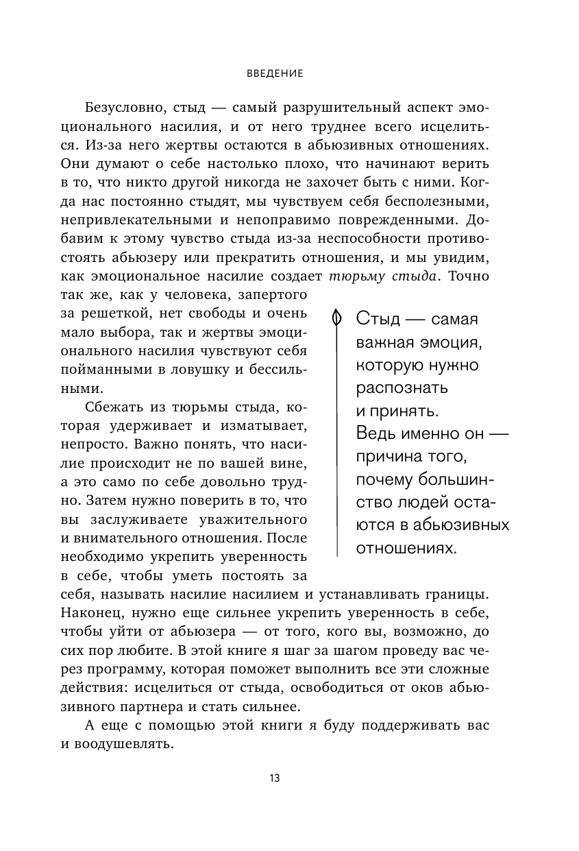 Книга о психологическом насилии. Интересно было прочитать о связи стыда и эмоционального насилия. Раньше я не обращала внимание на эту сторону. Хотя действительно большую роль в наших действиях играет стыд. Автор помогает понять, в чем суть психологического насилия. Дает разные опросники, с помощью которых можно увидеть, попадают ли действия партнера под психологическое насилие. Автор дает разные техники и упражнения для помощи и поддержки. Так же есть опросники на выявление нарцисса. Вторая часть книги дает методы и шаги в случае , если вы решили выйти из отношений или же остаться в них. Автор очень бережно обращается с читателями. Для меня это было важно. В книге нет осуждения, нет давления и категоричности, есть принятие и стремление помочь. Рекомендовала бы данную книгу для людей, столкнувшихся с психологическим насилием в семье с партнером или в родительской семье.